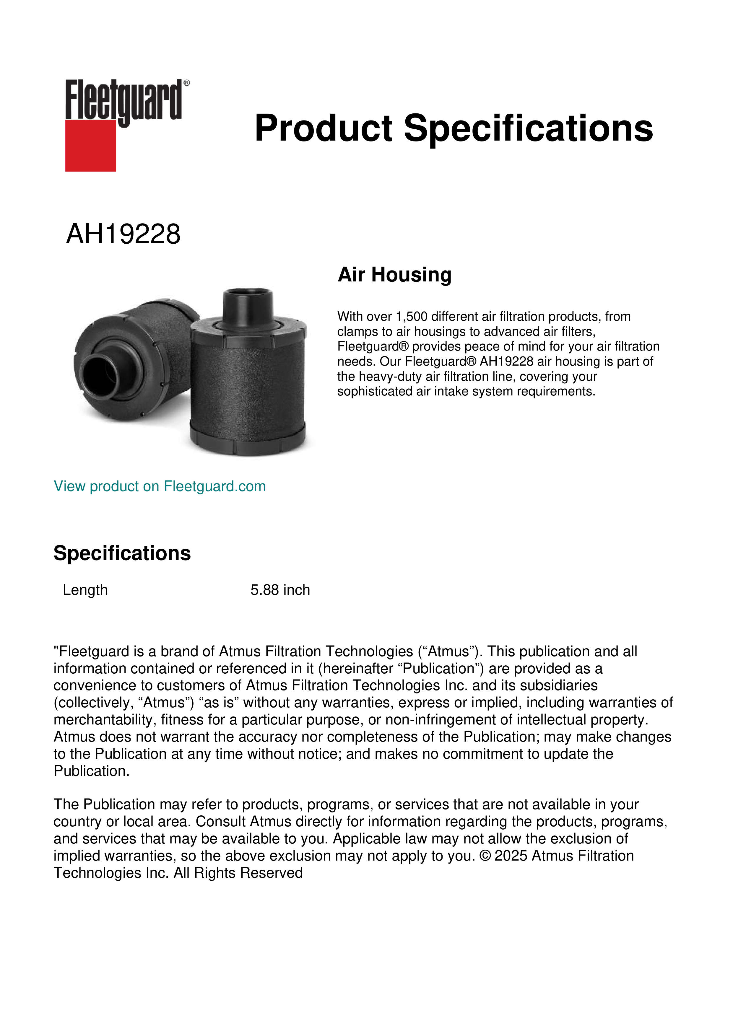 With over 1,500 different air filtration products, from clamps to air housings to advanced air filters, Fleetguard® provides peace of mind for your air filtration needs. Our Fleetguard® AH19228 air housing is part of the heavy-duty air filtration line, covering your sophisticated air intake system requirements.Specification