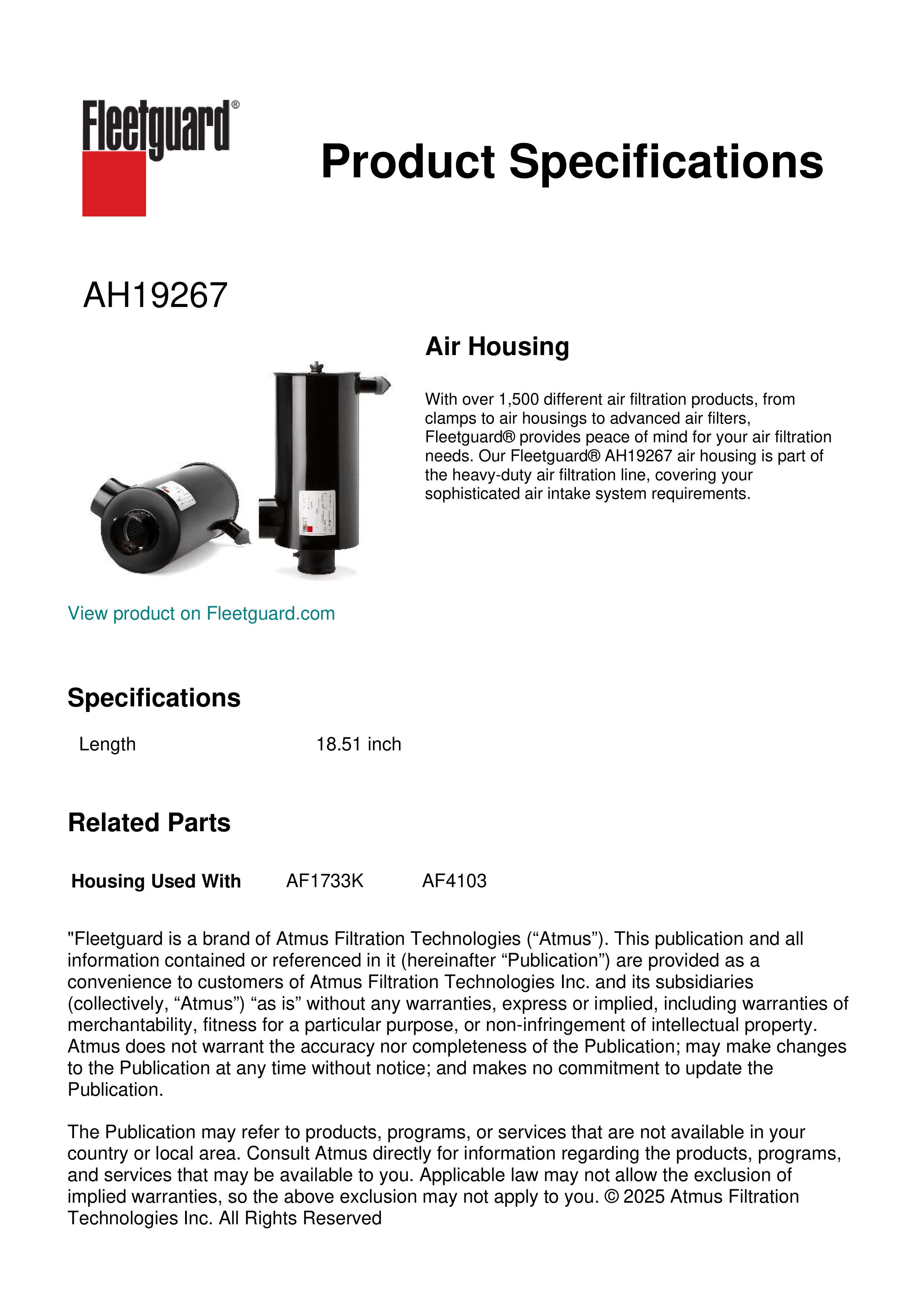 With over 1,500 different air filtration products, from clamps to air housings to advanced air filters, Fleetguard® provides peace of mind for your air filtration needs. Our Fleetguard® AH19267 air housing is part of the heavy-duty air filtration line, covering your sophisticated air intake system requirements.Specification