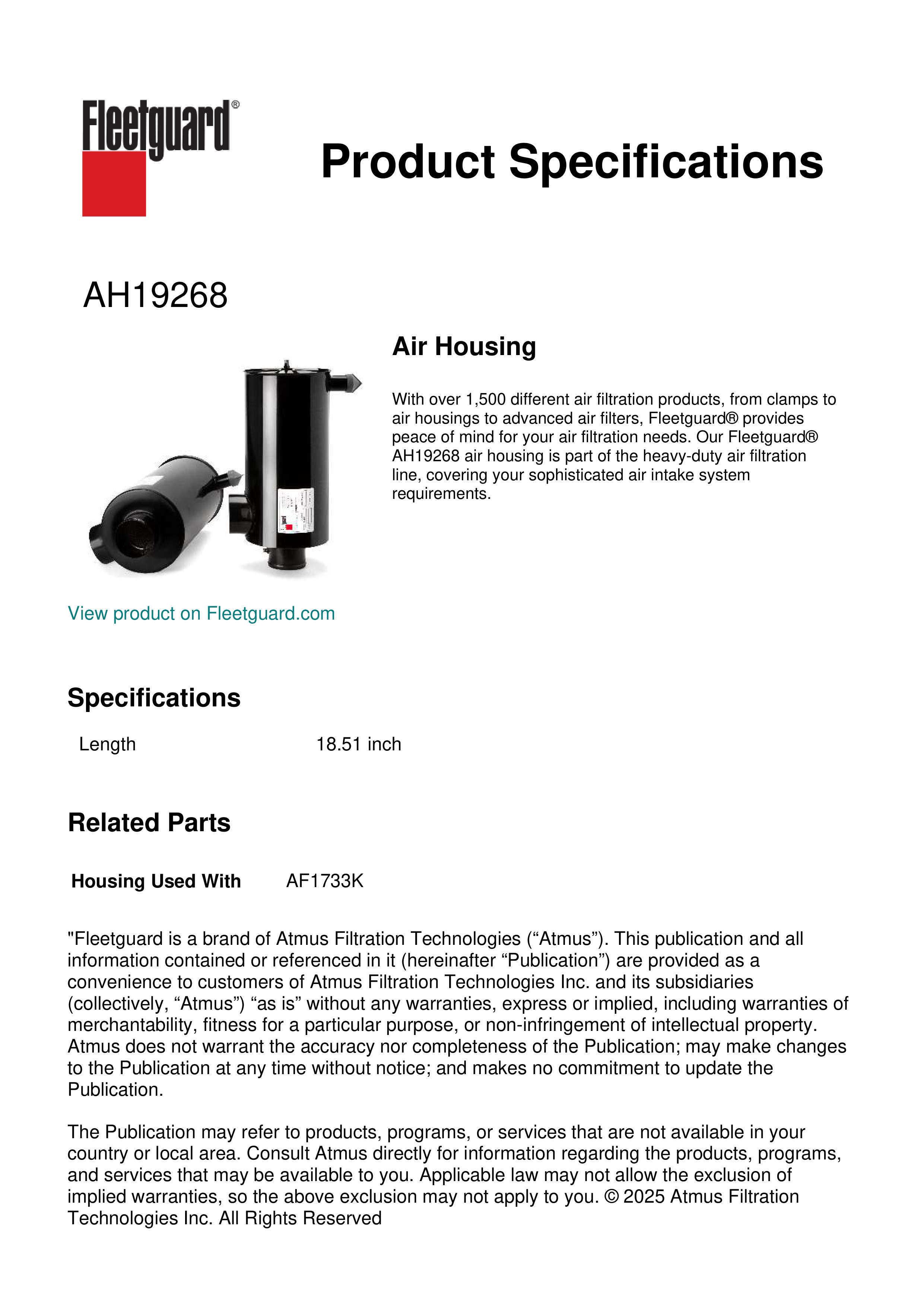 With over 1,500 different air filtration products, from clamps to air housings to advanced air filters, Fleetguard® provides peace of mind for your air filtration needs. Our Fleetguard® AH19268 air housing is part of the heavy-duty air filtration line, covering your sophisticated air intake system requirements.Specification