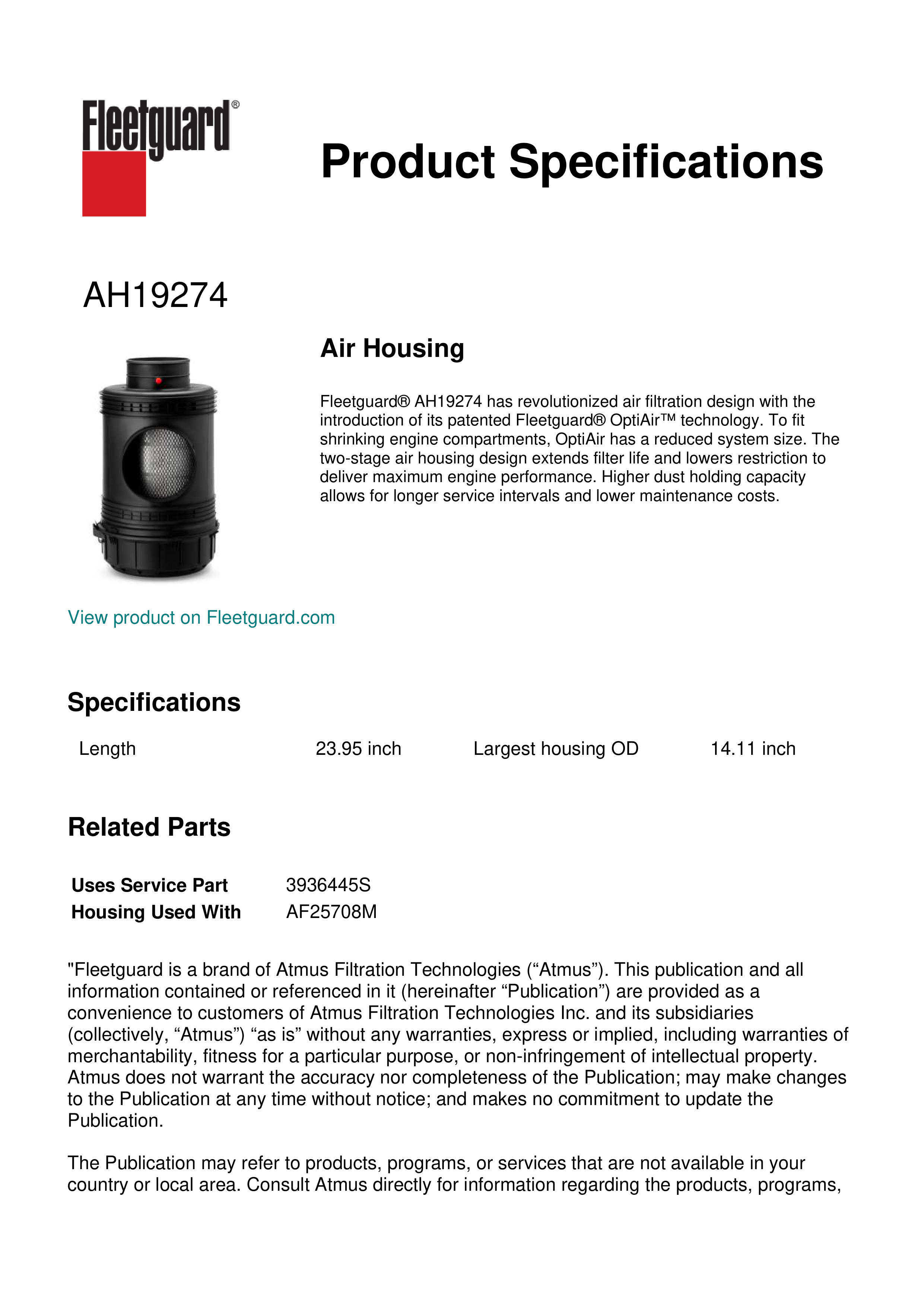 Fleetguard® AH19274 has revolutionized air filtration design with the introduction of its patented Fleetguard® OptiAir™ technology. To fit shrinking engine compartments, OptiAir has a reduced system size. The two-stage air housing design extends filter life and lowers restriction to deliver maximum engine performance. Higher dust holding capacity allows for longer service intervals and lower maintenance costs.