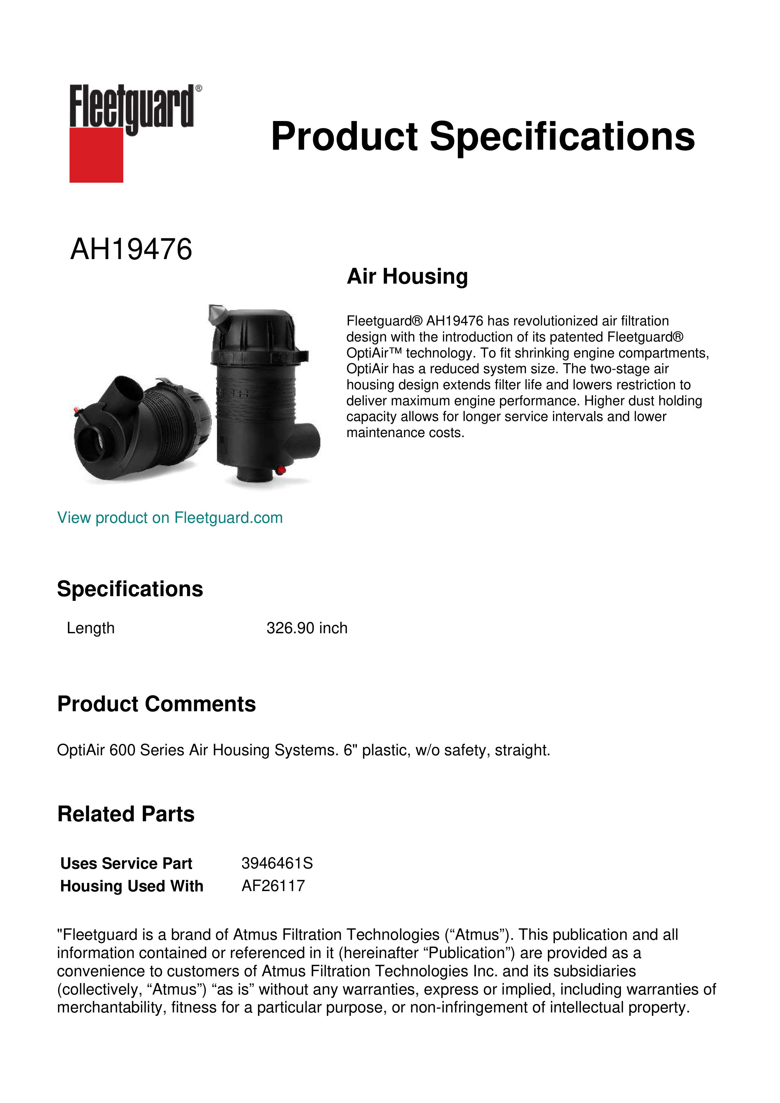 Fleetguard® AH19476 has revolutionized air filtration design with the introduction of its patented Fleetguard® OptiAir™ technology. To fit shrinking engine compartments, OptiAir has a reduced system size. The two-stage air housing design extends filter life and lowers restriction to deliver maximum engine performance. Higher dust holding capacity allows for longer service intervals and lower maintenance costs.Specification