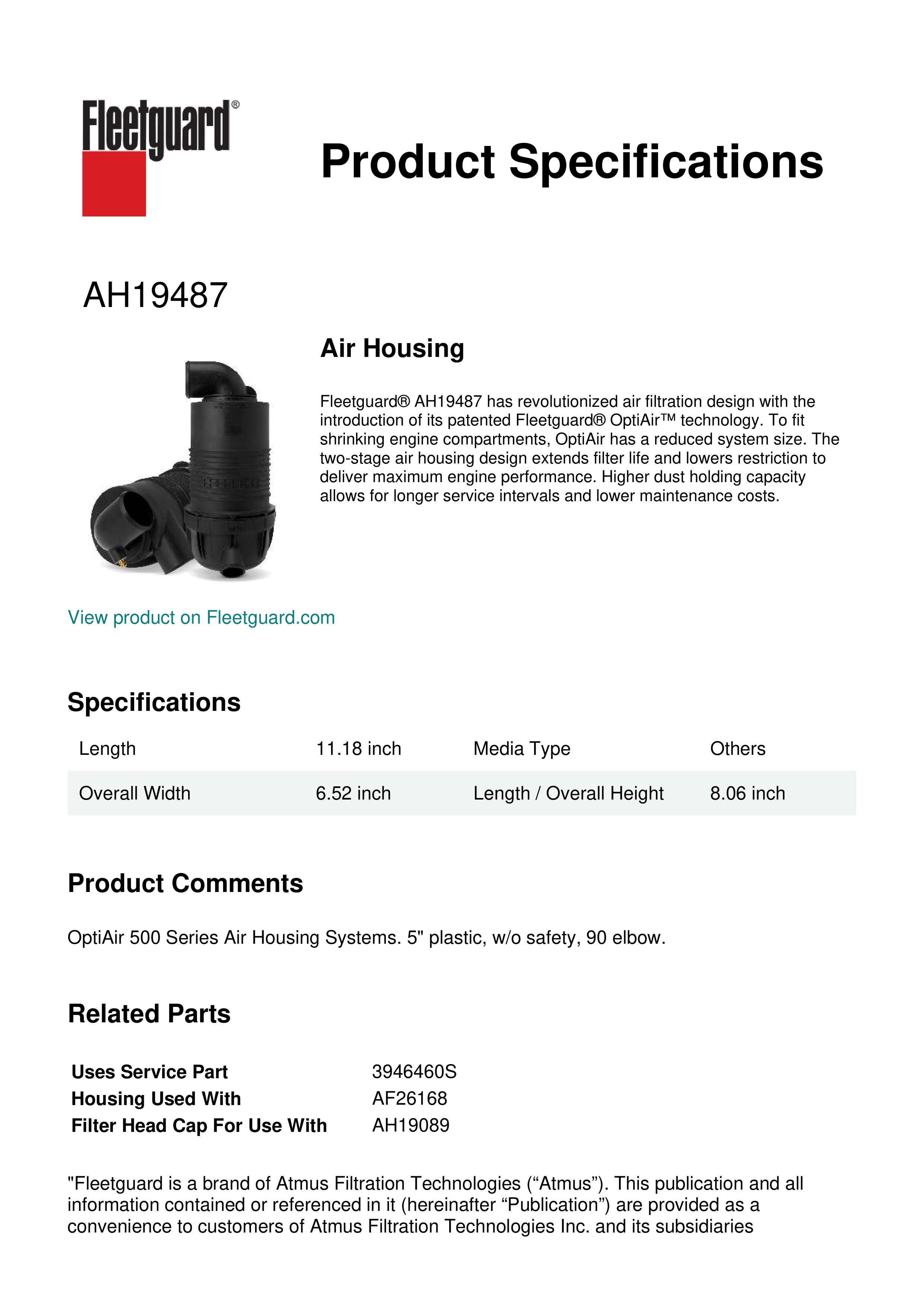 Fleetguard® AH19487 has revolutionized air filtration design with the introduction of its patented Fleetguard® OptiAir™ technology. To fit shrinking engine compartments, OptiAir has a reduced system size. The two-stage air housing design extends filter life and lowers restriction to deliver maximum engine performance. Higher dust holding capacity allows for longer service intervals and lower maintenance costs.Specification