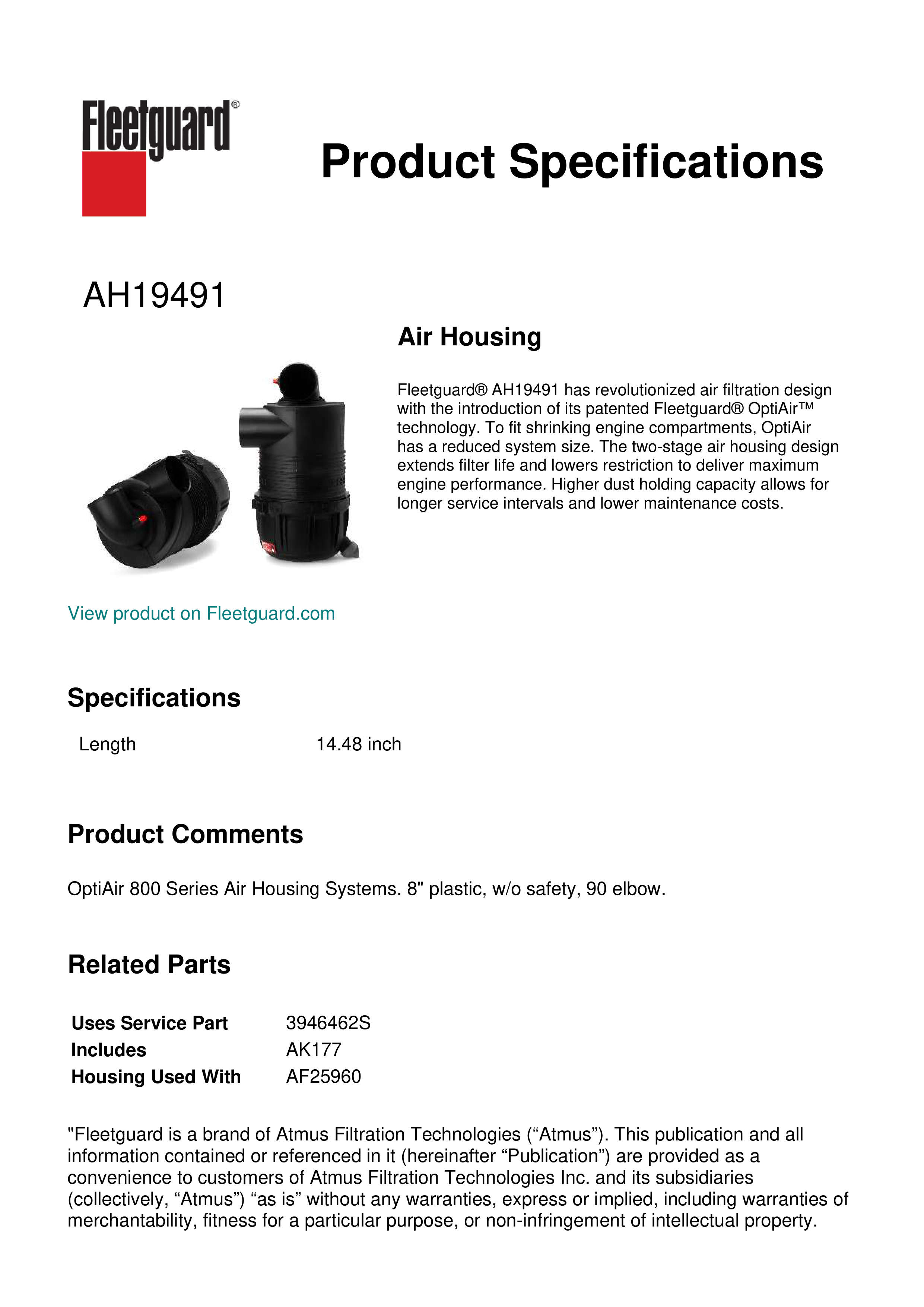 Fleetguard® AH19491 has revolutionized air filtration design with the introduction of its patented Fleetguard® OptiAir™ technology. To fit shrinking engine compartments, OptiAir has a reduced system size. The two-stage air housing design extends filter life and lowers restriction to deliver maximum engine performance. Higher dust holding capacity allows for longer service intervals and lower maintenance costs.