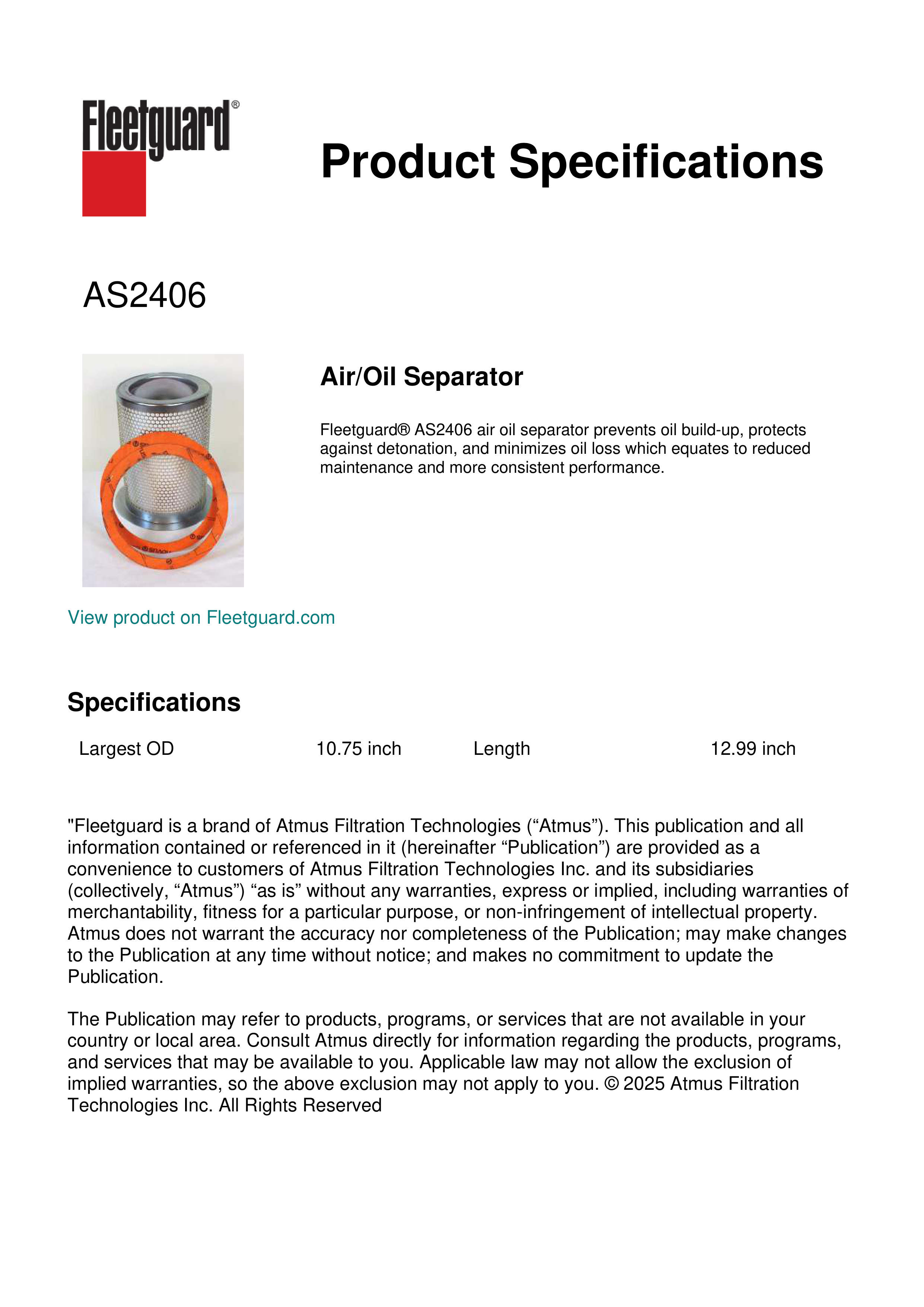Fleetguard® AS2406 air oil separator prevents oil build-up, protects against detonation, and minimizes oil loss which equates to reduced maintenance and more consistent performance.Specification