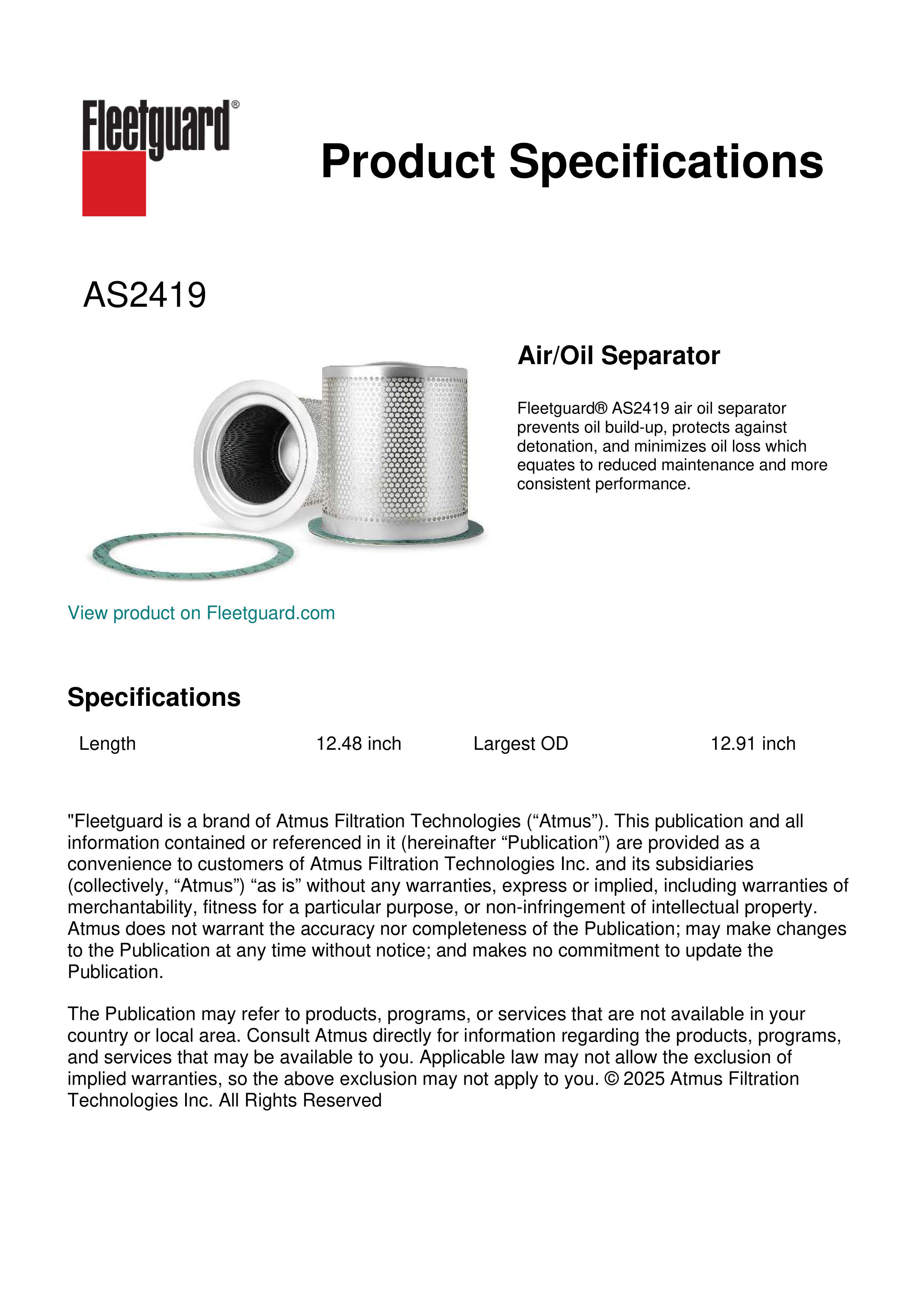 Fleetguard® AS2419 air oil separator prevents oil build-up, protects against detonation, and minimizes oil loss which equates to reduced maintenance and more consistent performance.Specification