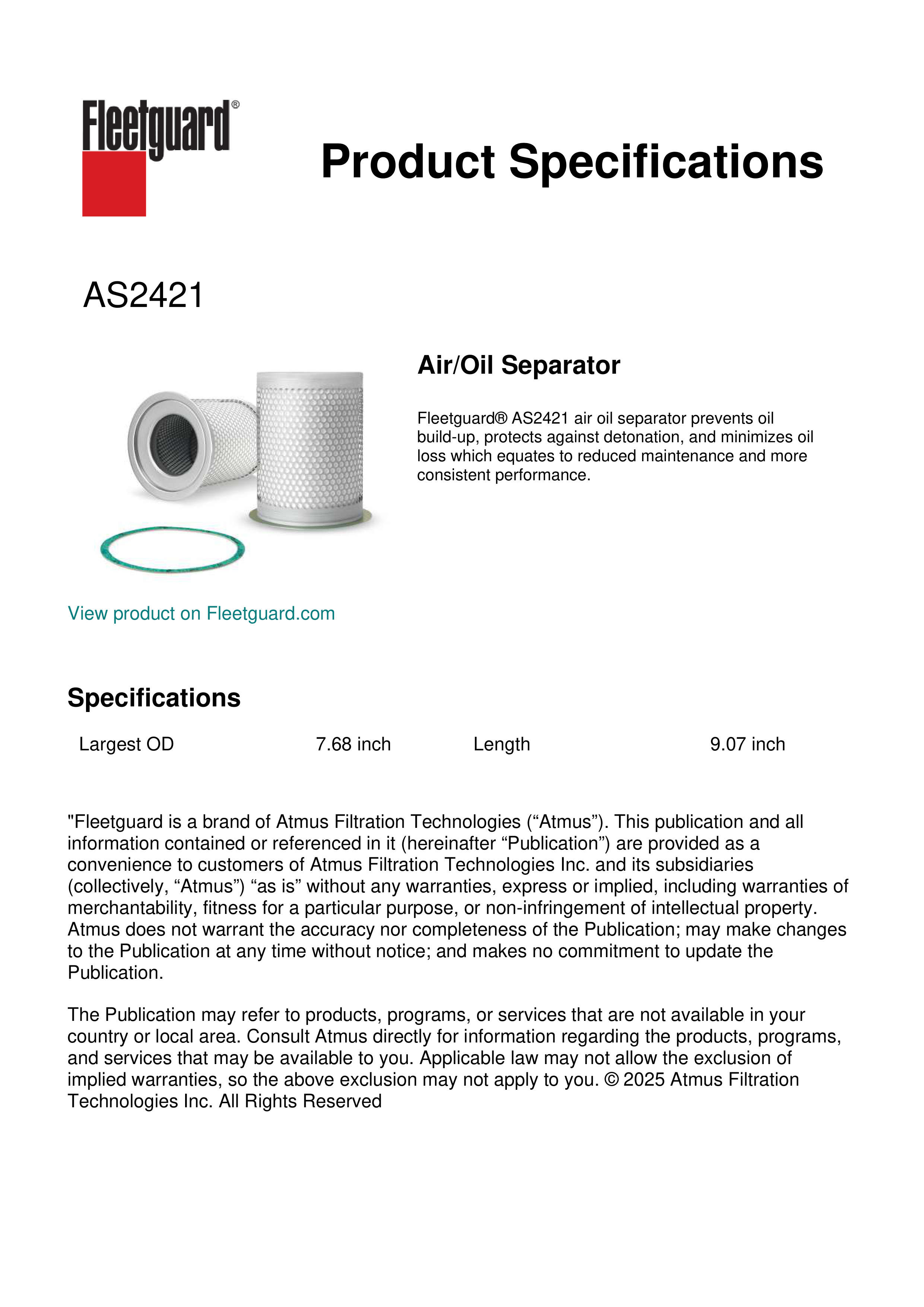 Fleetguard® AS2421 air oil separator prevents oil build-up, protects against detonation, and minimizes oil loss which equates to reduced maintenance and more consistent performance.Specification