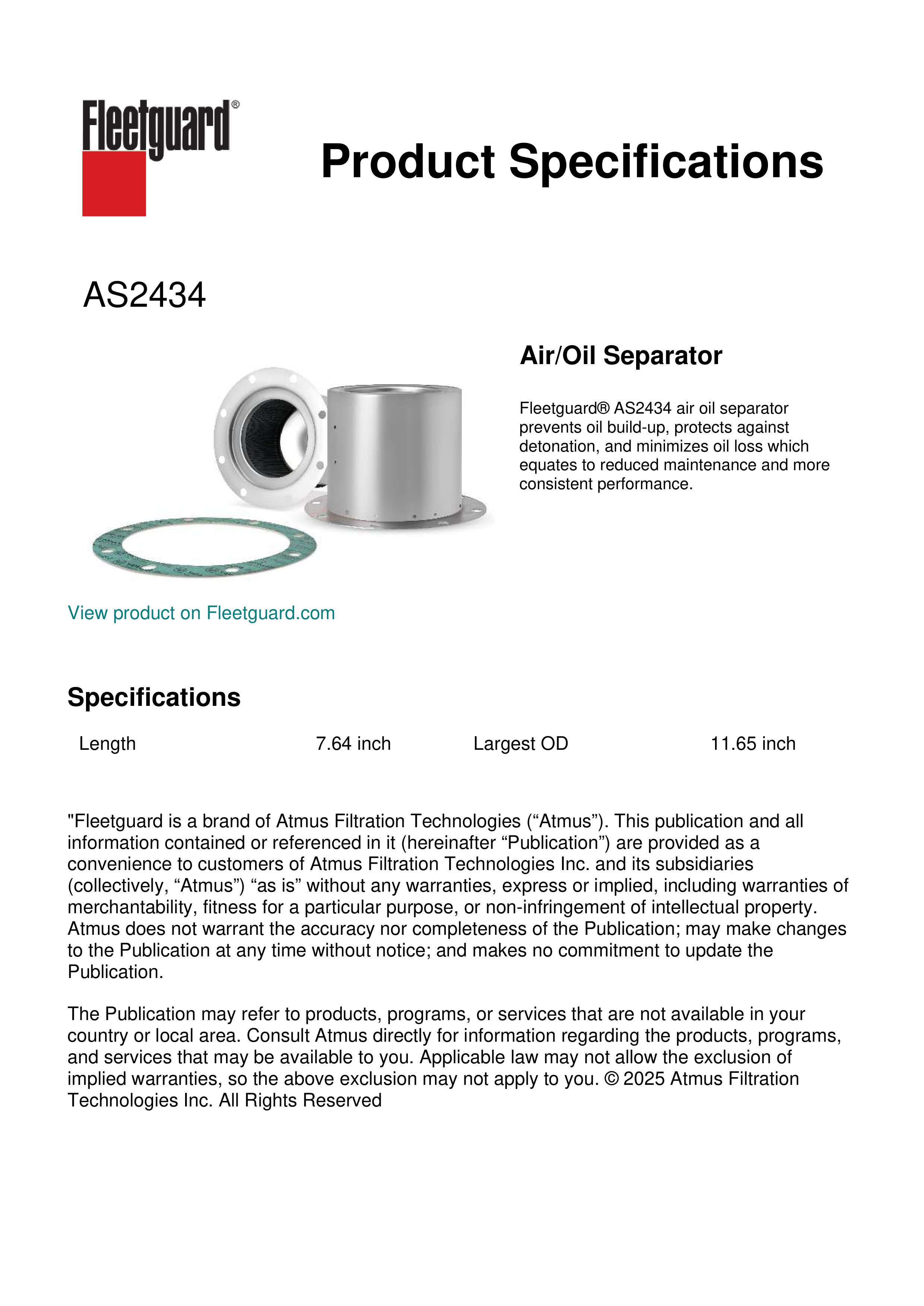Fleetguard® AS2434 air oil separator prevents oil build-up, protects against detonation, and minimizes oil loss which equates to reduced maintenance and more consistent performance.Specification
