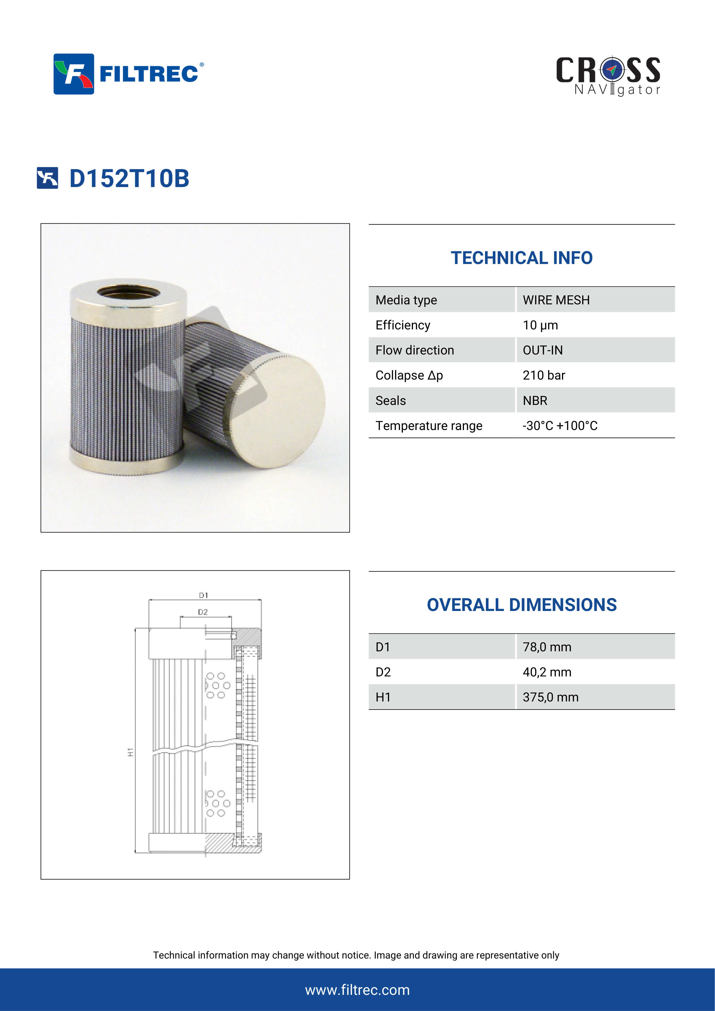 Genuine Filtrec D152T10B. This Filtrec element is designed to meet or exceed the quality and performance of brand OEM’s ensuring superior filtration performance and long-lasting durability.