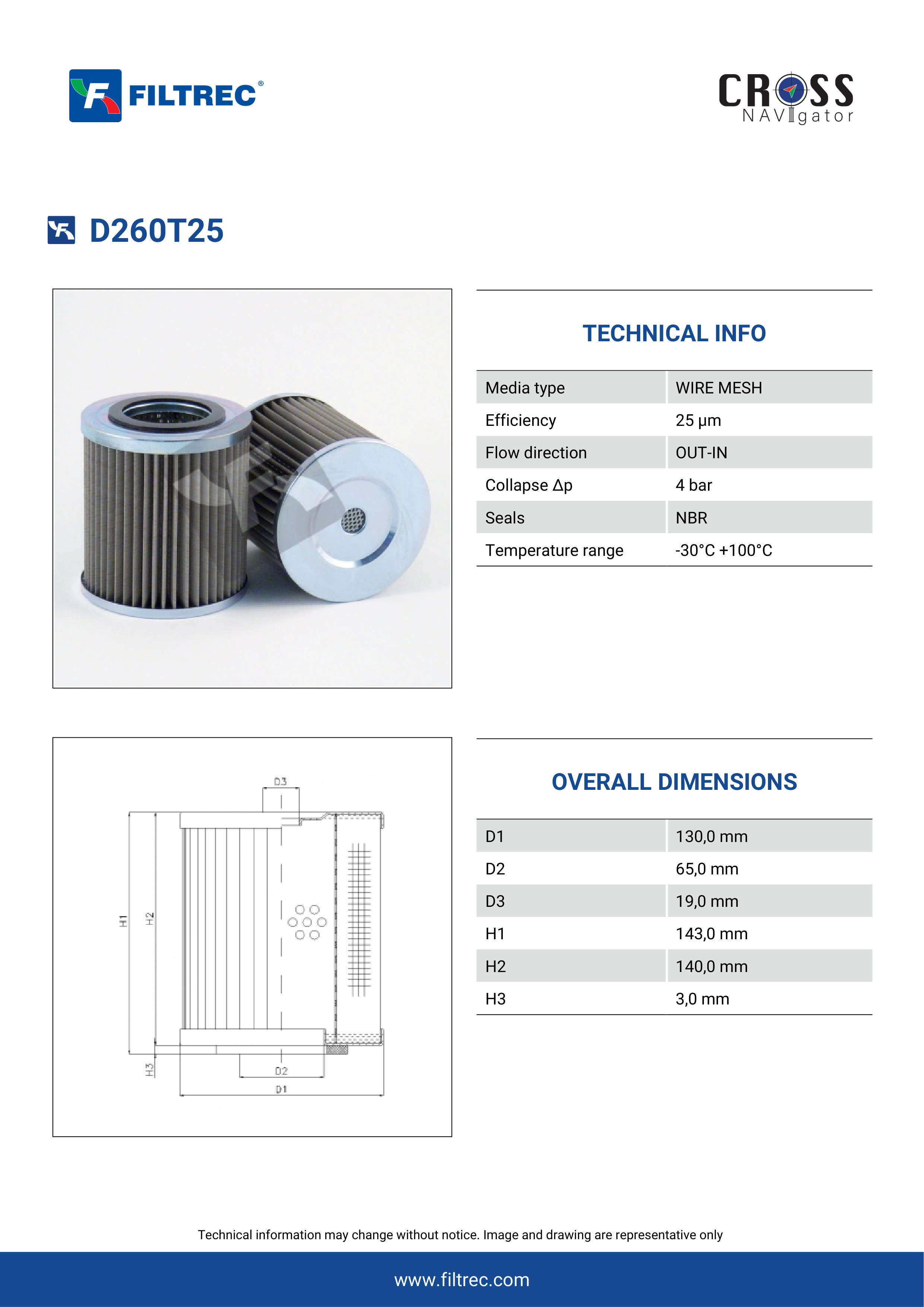 Genuine Filtrec D260T25. This Filtrec element is designed to meet or exceed the quality and performance of brand OEM’s ensuring superior filtration performance and long-lasting durability.