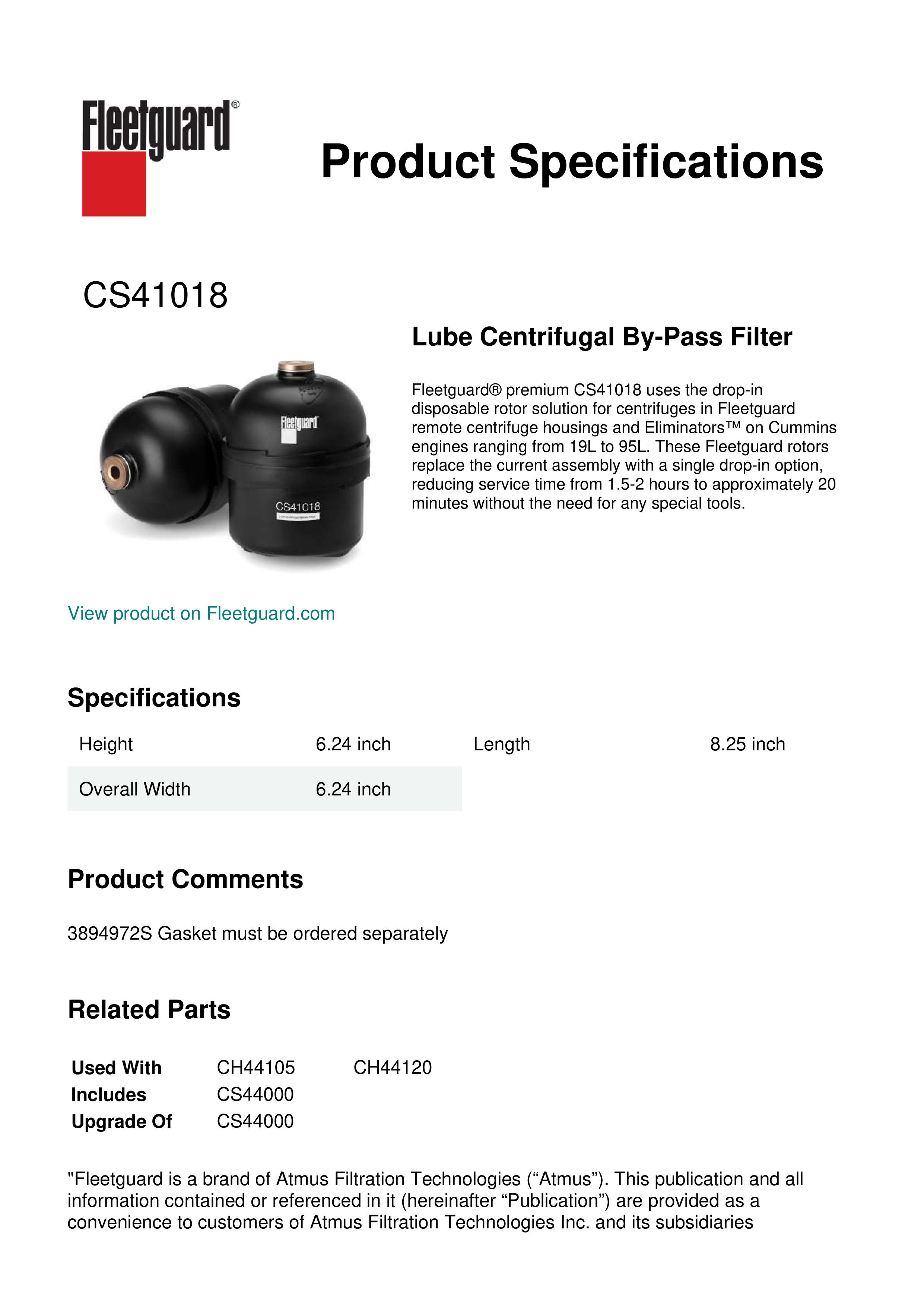Fleetguard® premium CS41018 uses the drop-in disposable rotor solution for centrifuges in Fleetguard remote centrifuge housings and Eliminators™ on Cummins engines ranging from 19L to 95L. These Fleetguard rotors replace the current assembly with a single drop-in option, reducing service time from 1.5-2 hours to approximately 20 minutes without the need for any special tools.Specification