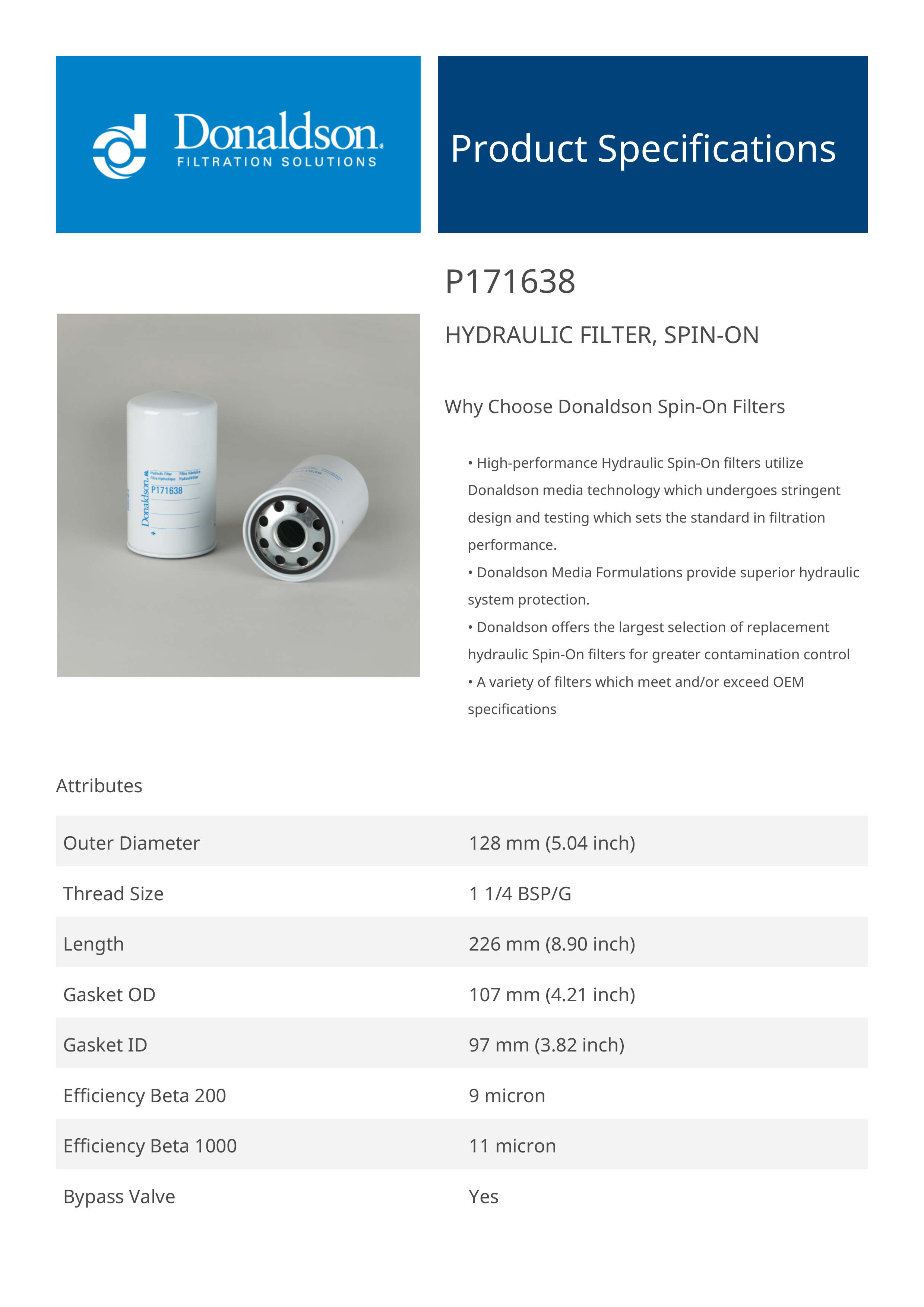 Genuine Donaldson P171638 Hydraulic Filter, Spin-On provides dependable protection for hydraulic systems by efficiently removing particulates and contaminants. It ensures clean hydraulic fluid, promoting smooth operation and extending the lifespan of critical system components.