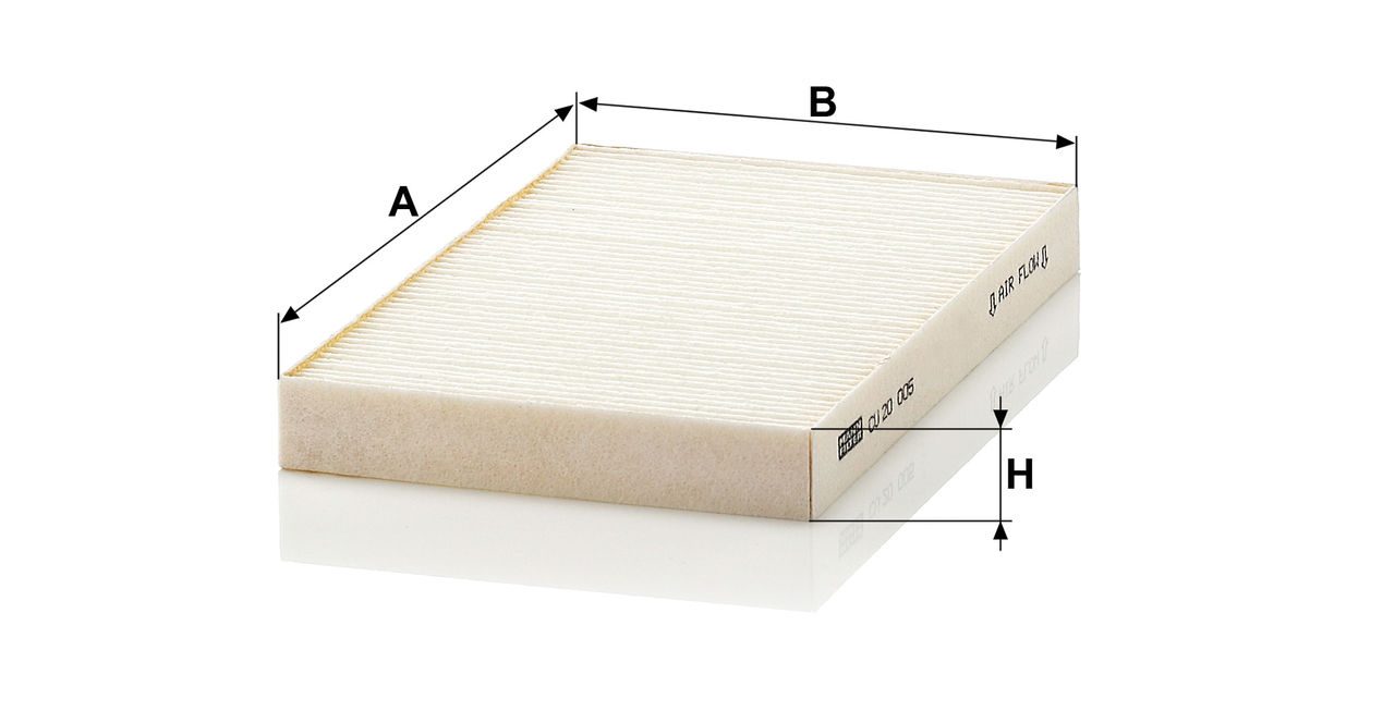 High-quality MANN-FILTER cabin filters offer almost 100% protection against particles such as pollen, diesel soot and tyre abrasion - for a feel-good climate in the vehicle interior and protection of the air conditioning system. Exact fit and perfect tightness ensure constant filtration performance during the entire service interval / Optimum vehicle interior ventilation due to the high air flow capacity.