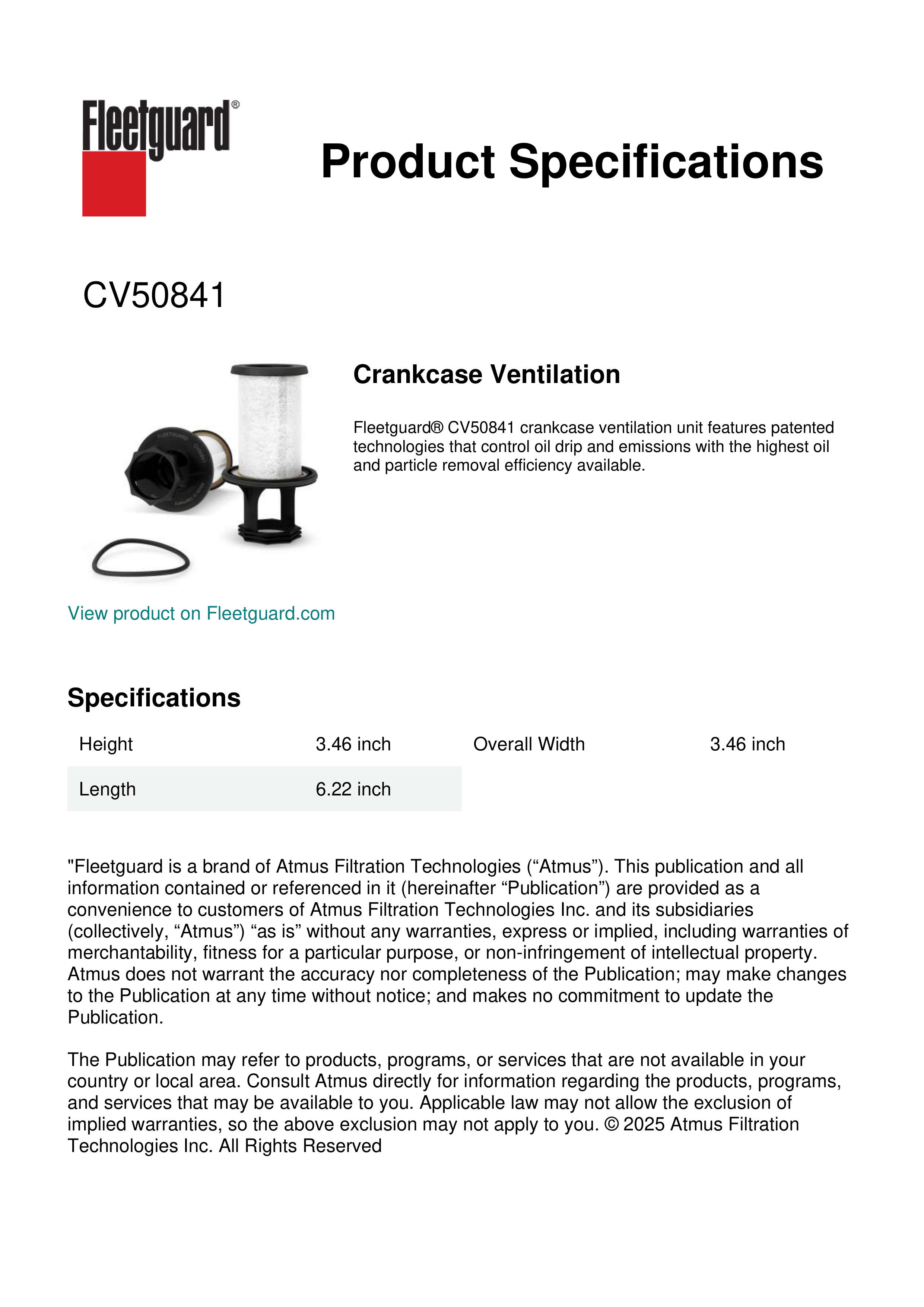 Fleetguard® CV50841 crankcase ventilation unit features patented technologies that control oil drip and emissions with the highest oil and particle removal efficiency available.Specification
