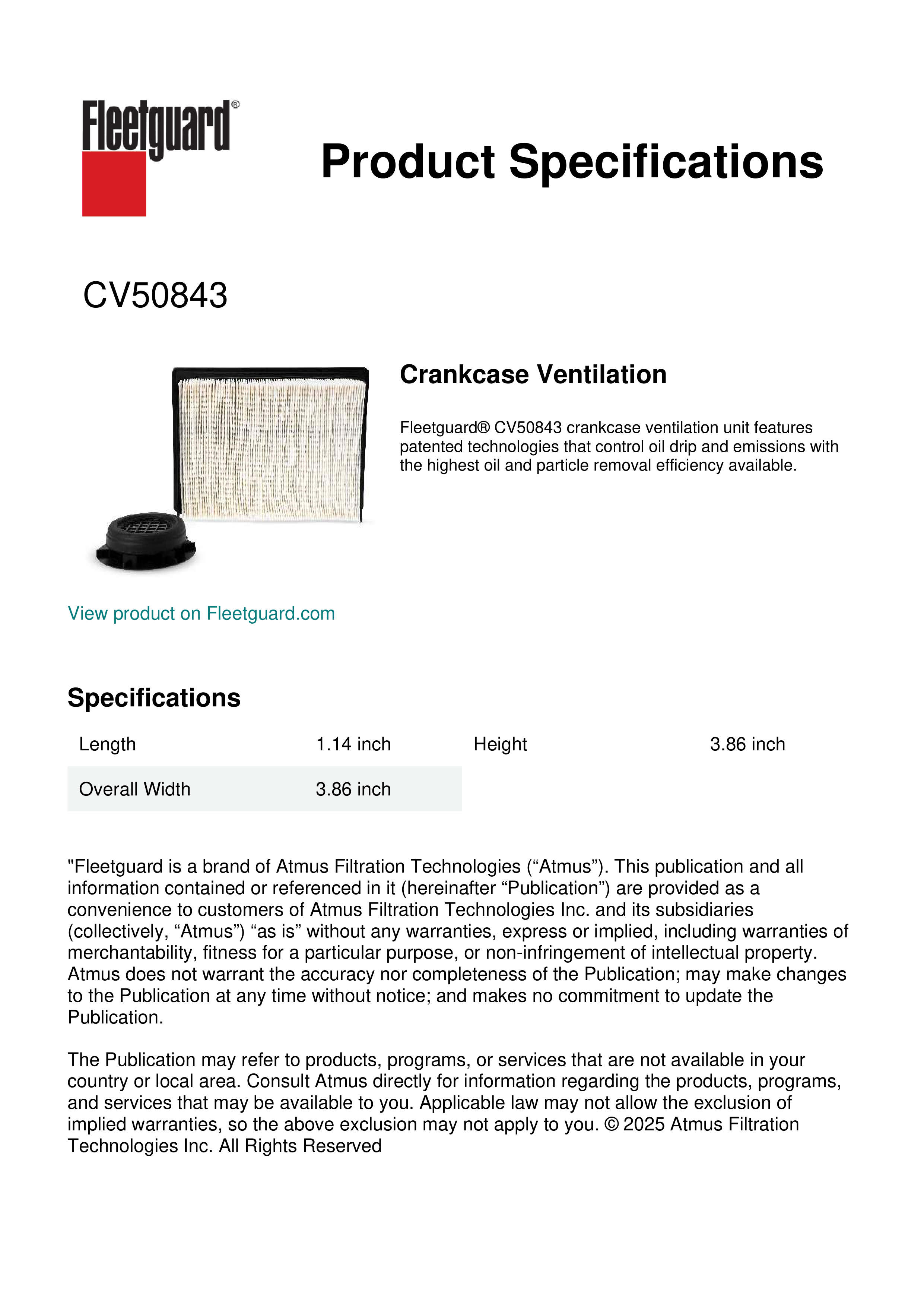 Fleetguard® CV50843 crankcase ventilation unit features patented technologies that control oil drip and emissions with the highest oil and particle removal efficiency available.Specification