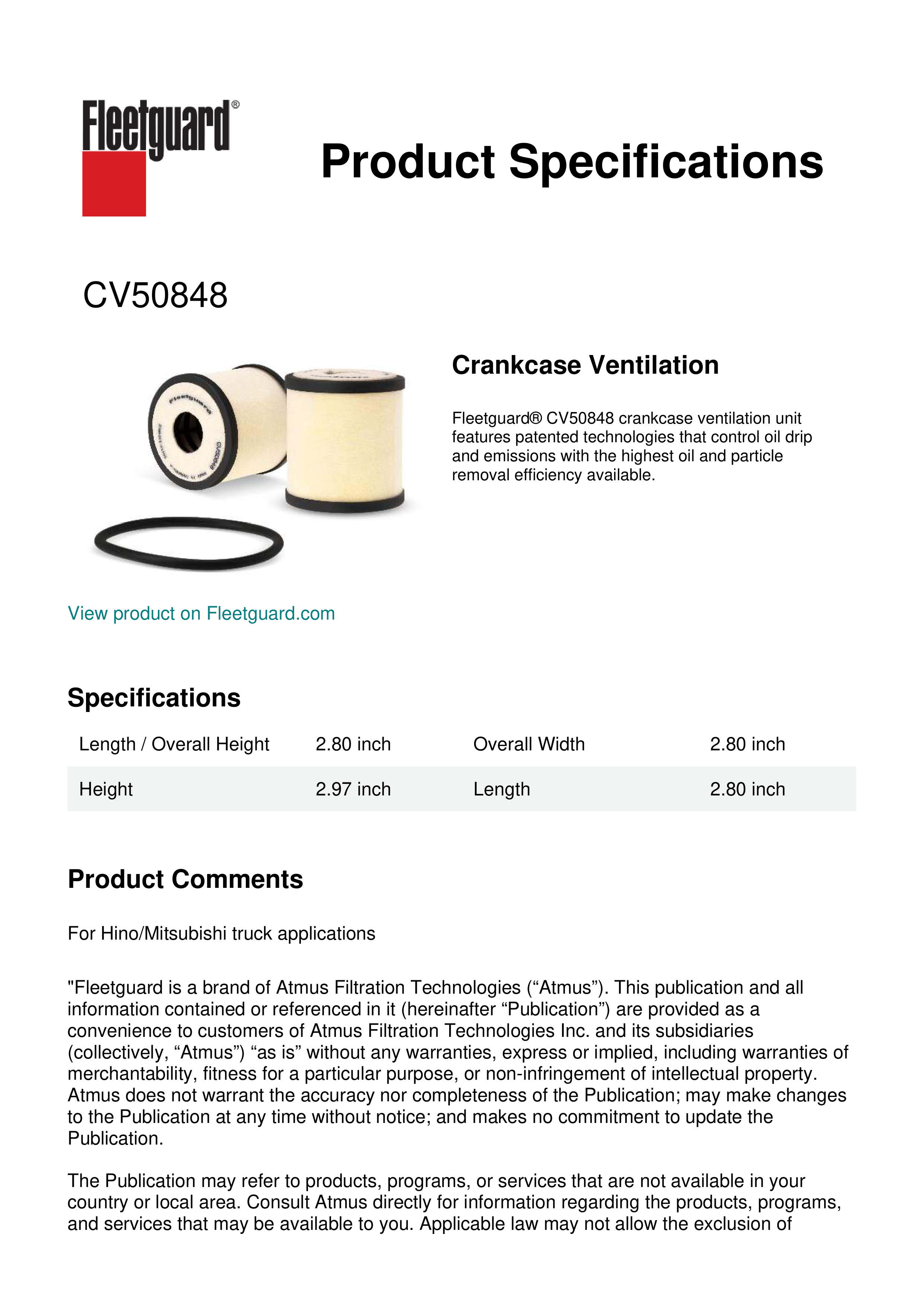 Fleetguard® CV50848 crankcase ventilation unit features patented technologies that control oil drip and emissions with the highest oil and particle removal efficiency available.Specification