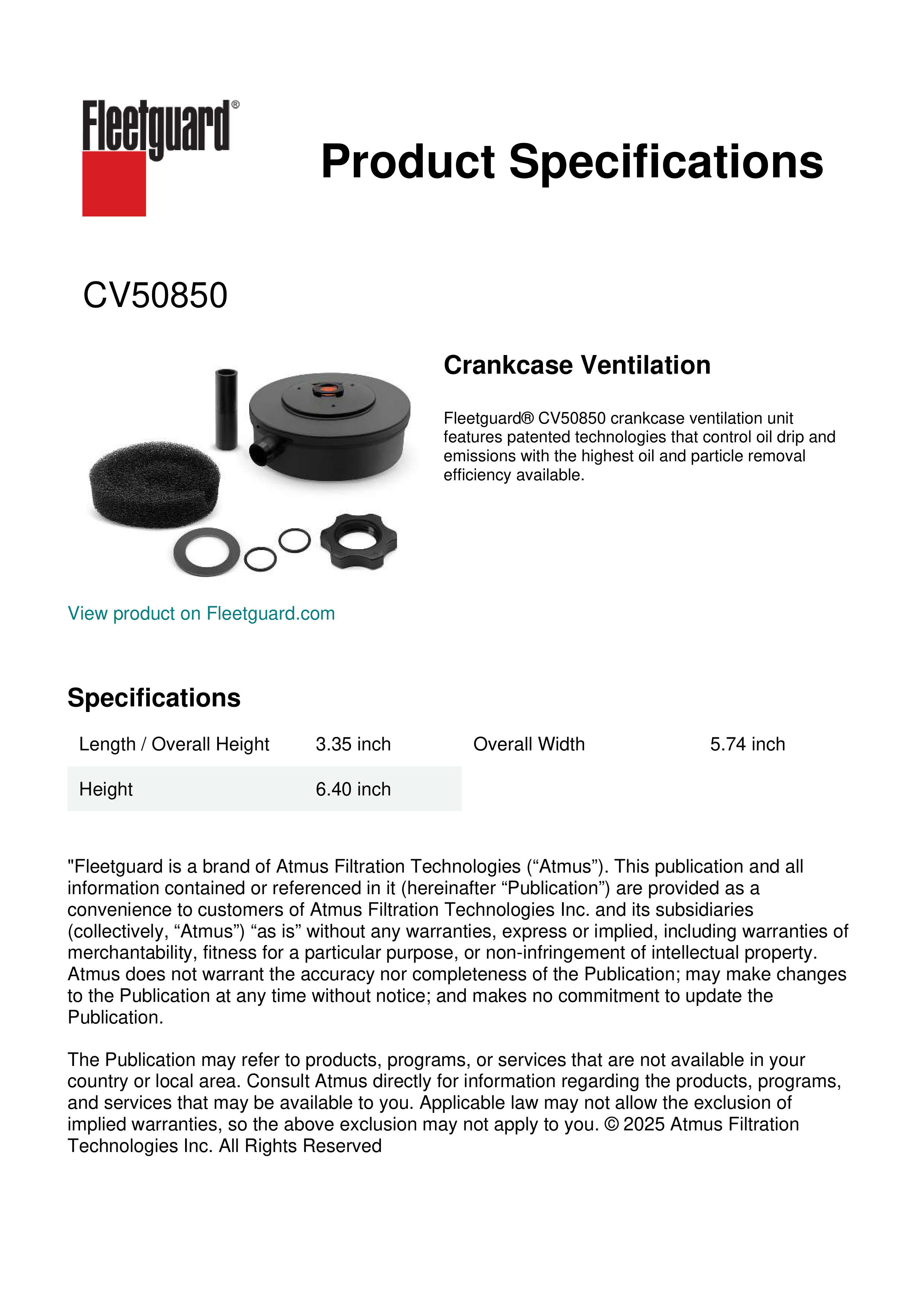 Fleetguard® CV50850 crankcase ventilation unit features patented technologies that control oil drip and emissions with the highest oil and particle removal efficiency available.Specification