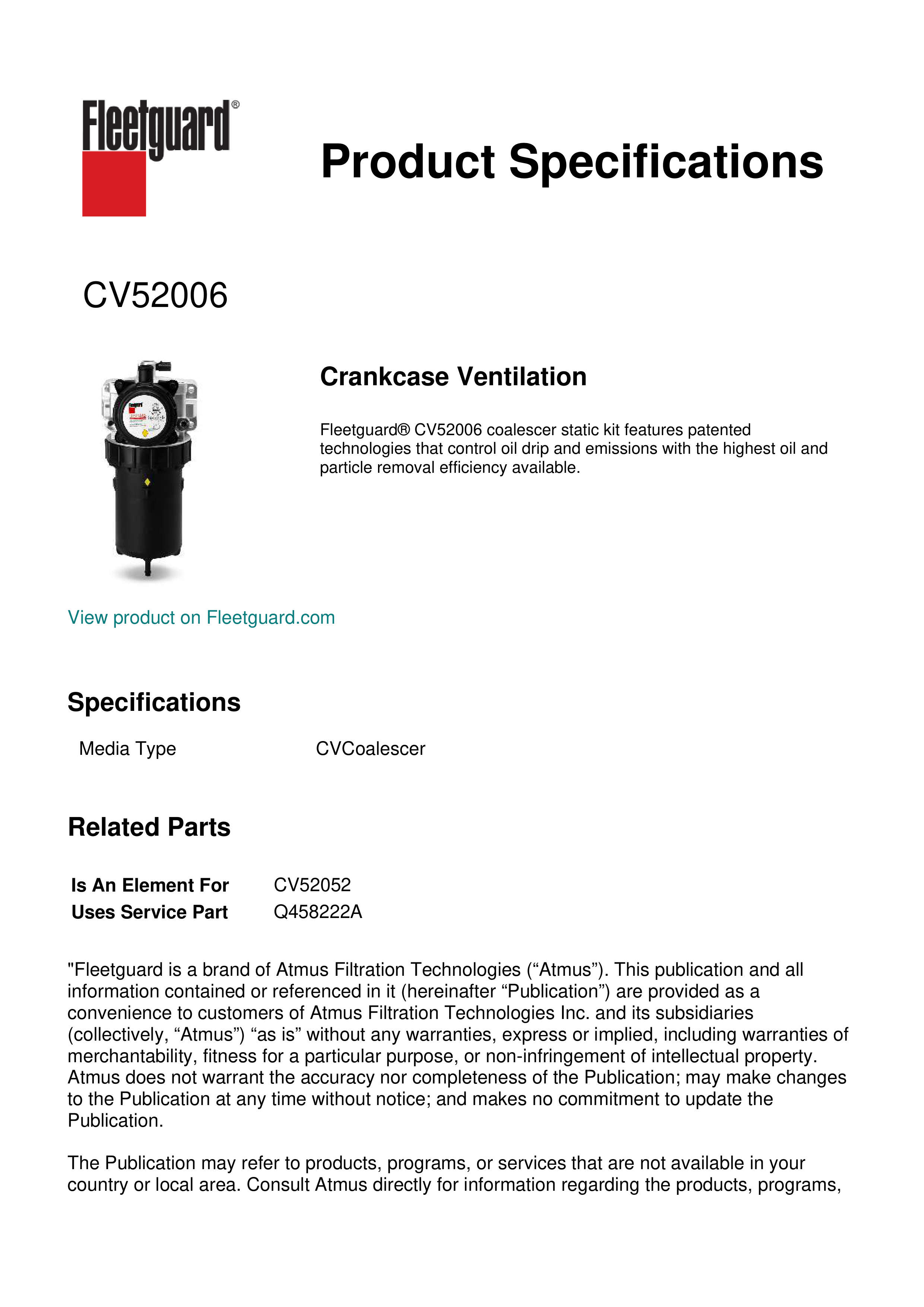 Fleetguard® CV52006 coalescer static kit features patented technologies that control oil drip and emissions with the highest oil and particle removal efficiency available.Specification