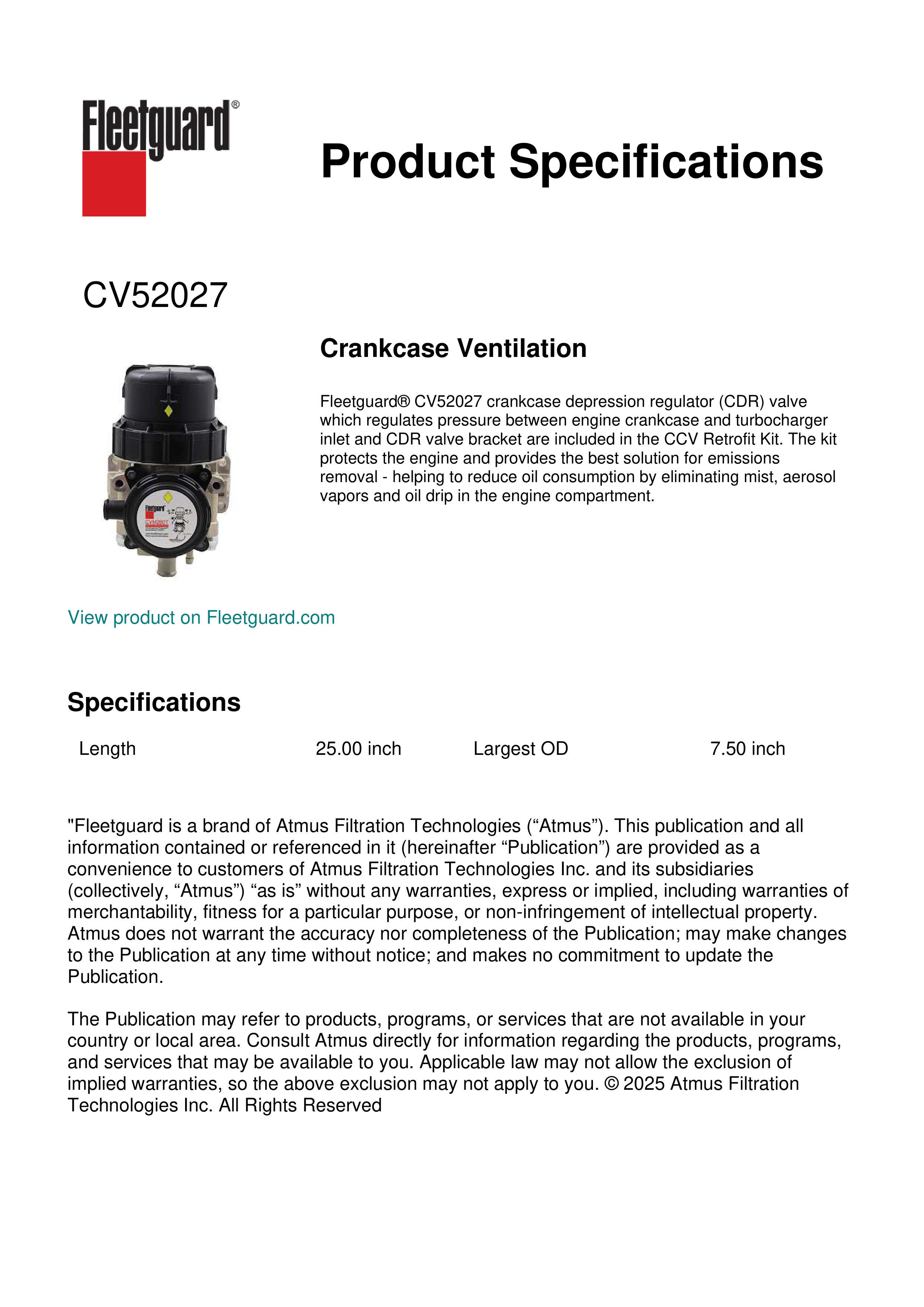 Fleetguard® CV52027 crankcase depression regulator (CDR) valve which regulates pressure between engine crankcase and turbocharger inlet and CDR valve bracket are included in the CCV Retrofit Kit. The kit protects the engine and provides the best solution for emissions removal - helping to reduce oil consumption by eliminating mist, aerosol vapors and oil drip in the engine compartment.Specification