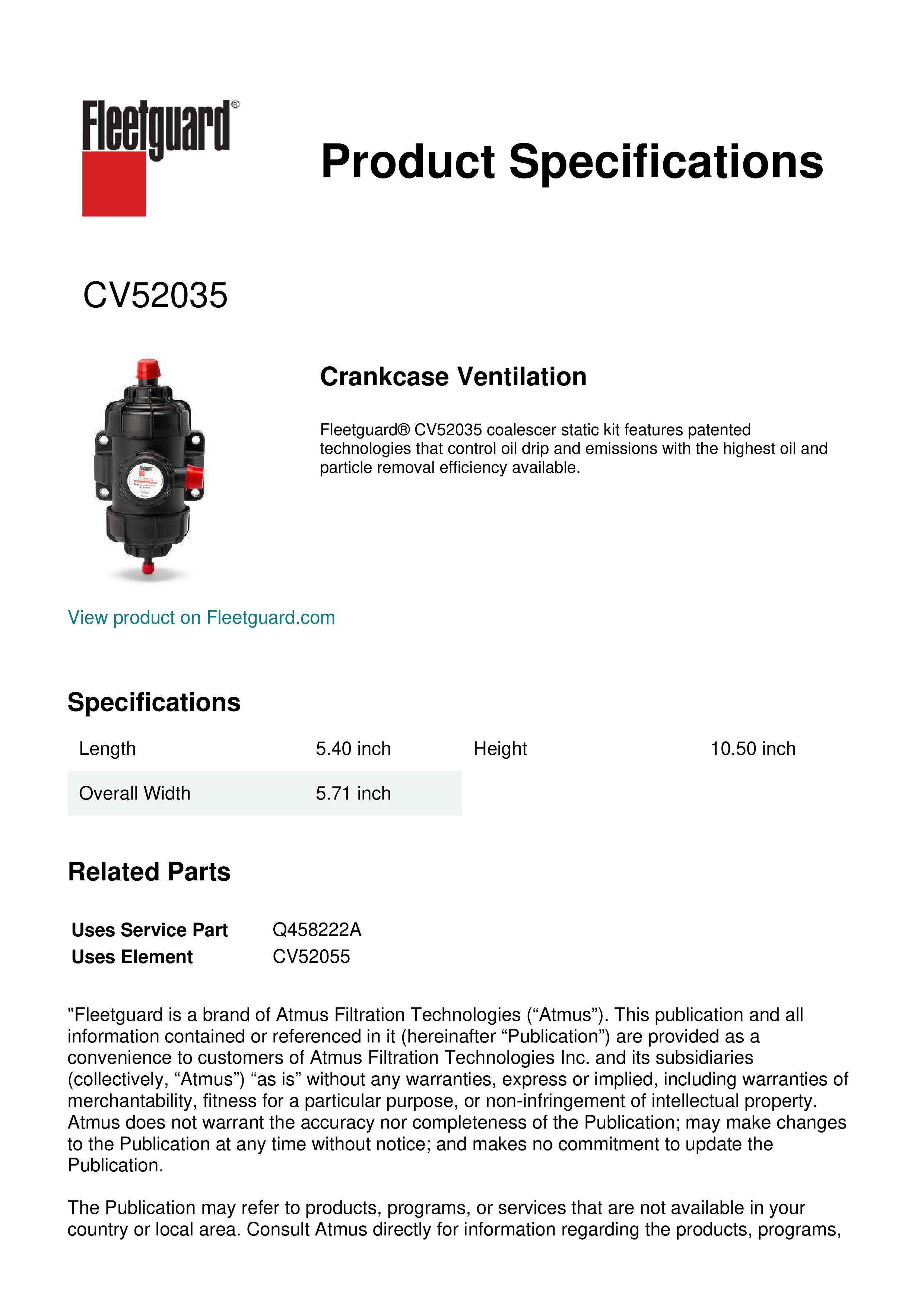 Fleetguard® CV52035 coalescer static kit features patented technologies that control oil drip and emissions with the highest oil and particle removal efficiency available.Specification