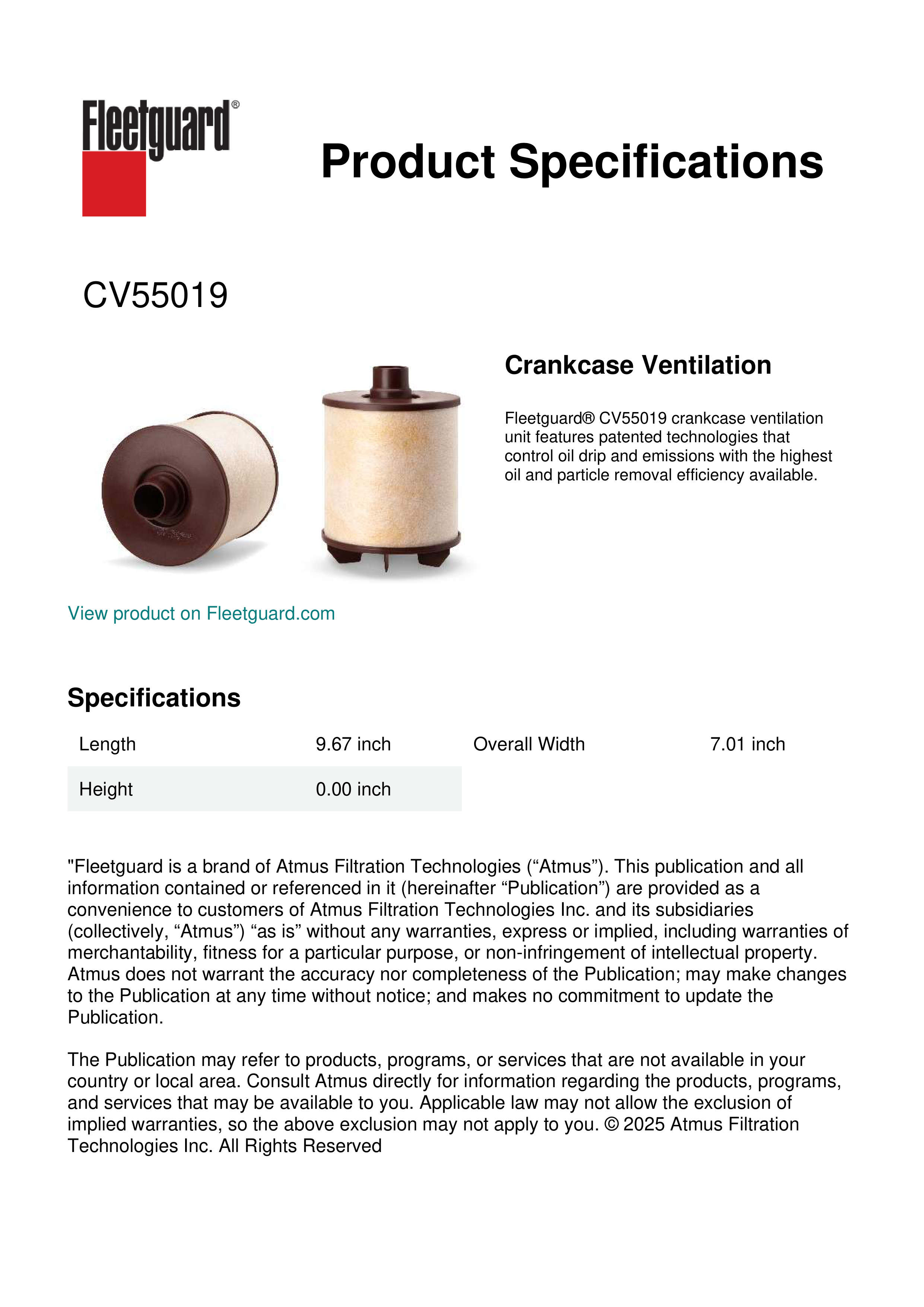 Fleetguard® CV55019 crankcase ventilation unit features patented technologies that control oil drip and emissions with the highest oil and particle removal efficiency available.Specification