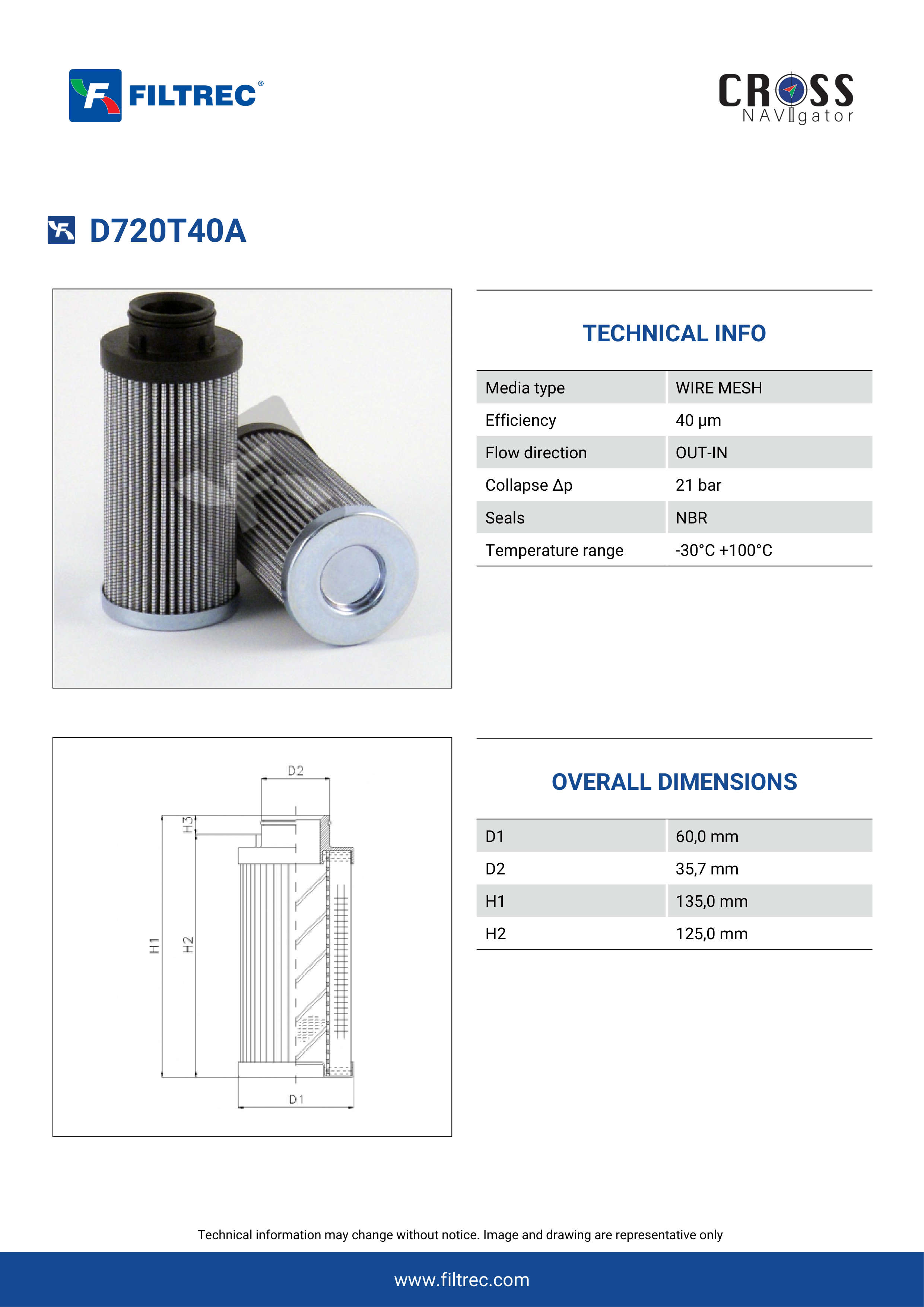 Genuine Filtrec D720T40A. This Filtrec element is designed to meet or exceed the quality and performance of brand OEM’s ensuring superior filtration performance and long-lasting durability.