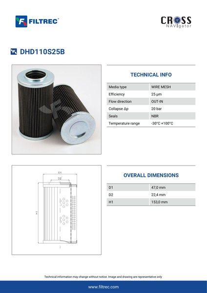 Genuine Filtrec DHD110S25B. This Filtrec element is designed to meet or exceed the quality and performance of brand OEM’s ensuring superior filtration performance and long-lasting durability.