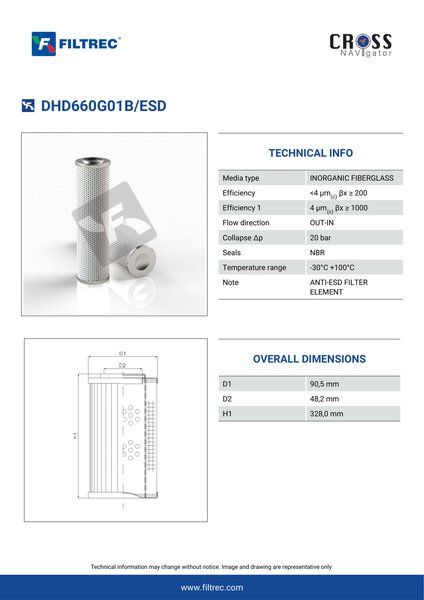 Genuine Filtrec DHD660G01B/ESD. This Filtrec element is designed to meet or exceed the quality and performance of brand OEM’s ensuring superior filtration performance and long-lasting durability.Engineered with their high performance media and a durable design, the DHD660G01B/ESD provides reliable and consistent performance over its lifespan, even in harsh operating environments. When you order from FilterFinder, you can trust that you are getting a reliable and high-quality replacement filter that will keep your system running smoothly.
