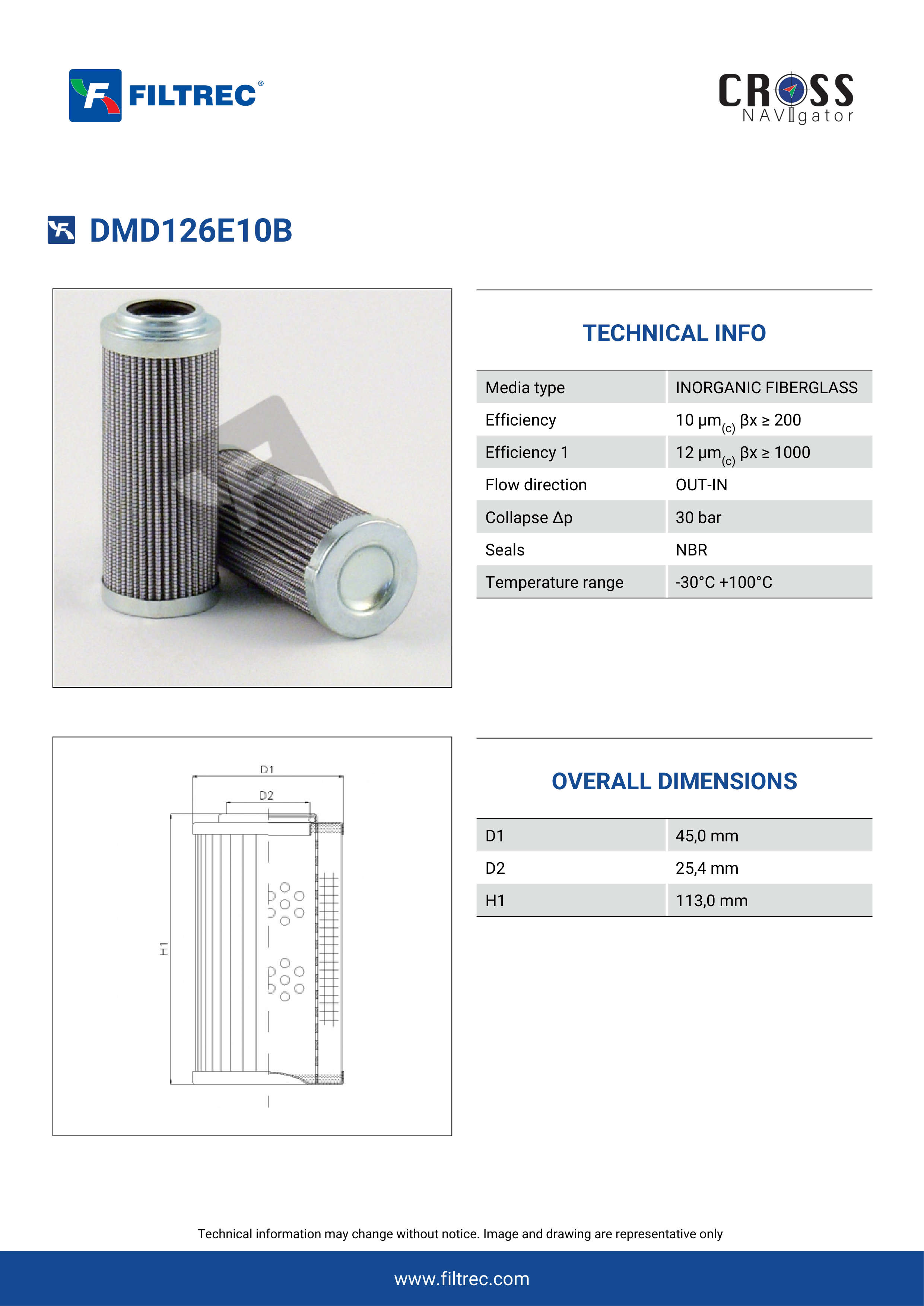 Genuine Filtrec DMD126E10B. This Filtrec element is designed to meet or exceed the quality and performance of brand OEM’s ensuring superior filtration performance and long-lasting durability.Engineered with their high performance media and a durable design, the DMD126E10B provides reliable and consistent performance over its lifespan, even in harsh operating environments. When you order from FilterFinder, you can trust that you are getting a reliable and high-quality replacement filter that will keep your system running smoothly.