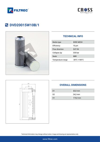 Genuine Filtrec DVD20015W10B/1. This Filtrec element is designed to meet or exceed the quality and performance of brand OEM’s ensuring superior filtration performance and long-lasting durability.Engineered with their high performance media and a durable design, the DVD20015W10B/1 provides reliable and consistent performance over its lifespan, even in harsh operating environments. When you order from FilterFinder, you can trust that you are getting a reliable and high-quality replacement filter that will keep your system running smoothly.