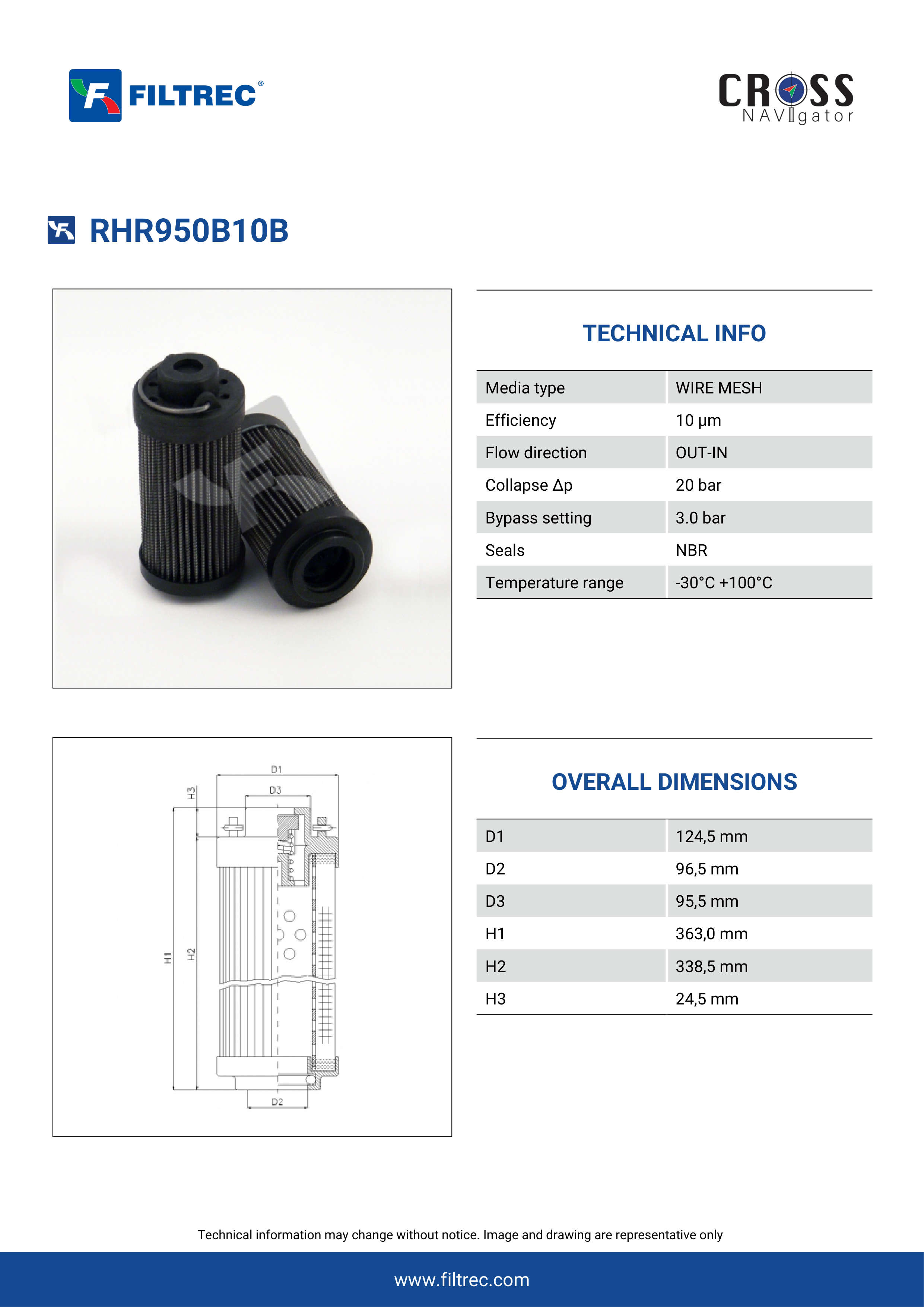 Genuine Filtrec RHR950B10B. This Filtrec element is designed to meet or exceed the quality and performance of brand OEM’s ensuring superior filtration performance and long-lasting durability.