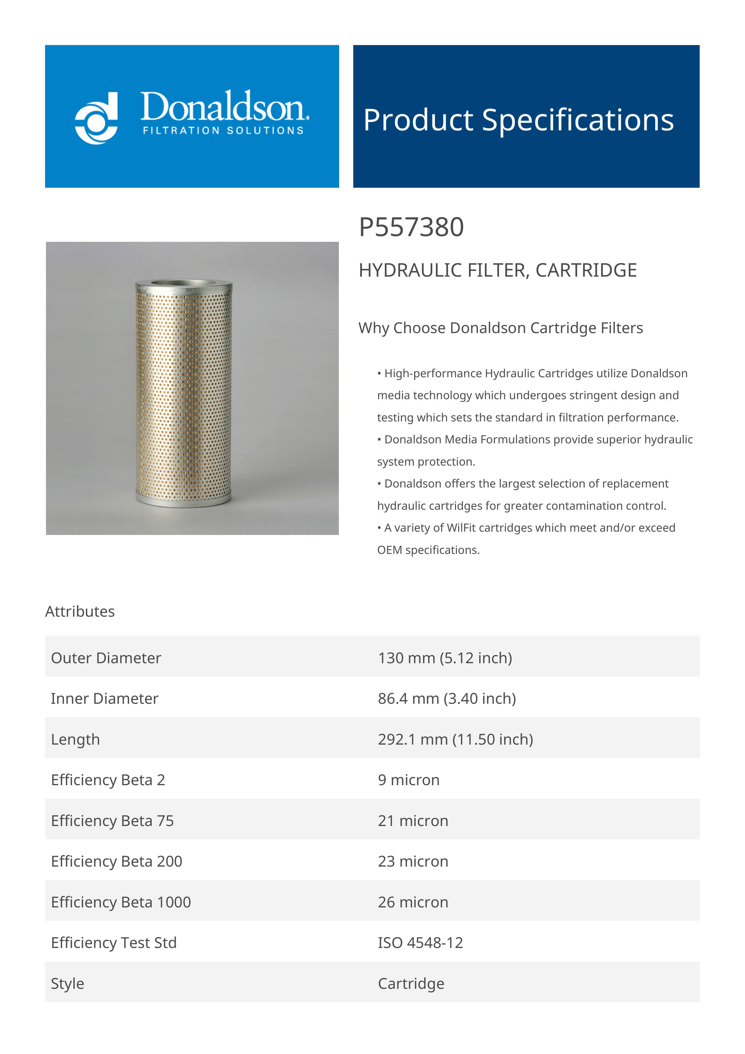 Genuine Donaldson P557380 Hydraulic Filter, Cartridge is designed to provide superior protection for your hydraulic system, effectively capturing contaminants to ensure clean fluid circulation. With high-quality filtration media, it extends equipment life, improves operational efficiency, and maintains fluid cleanliness even in the most demanding environments.