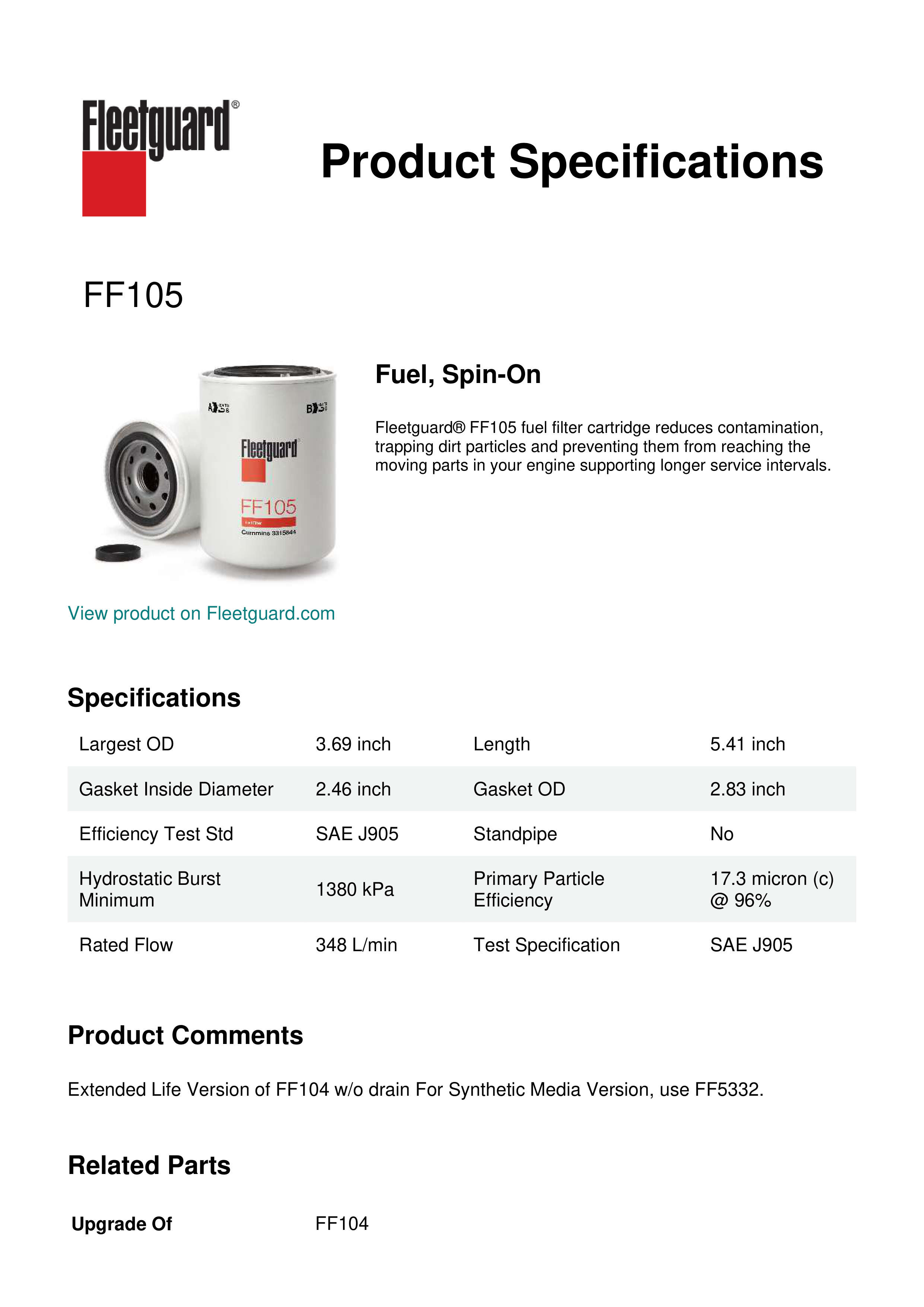 Fleetguard® FF105 fuel filter cartridge reduces contamination, trapping dirt particles and preventing them from reaching the moving parts in your engine supporting longer service intervals.Specification