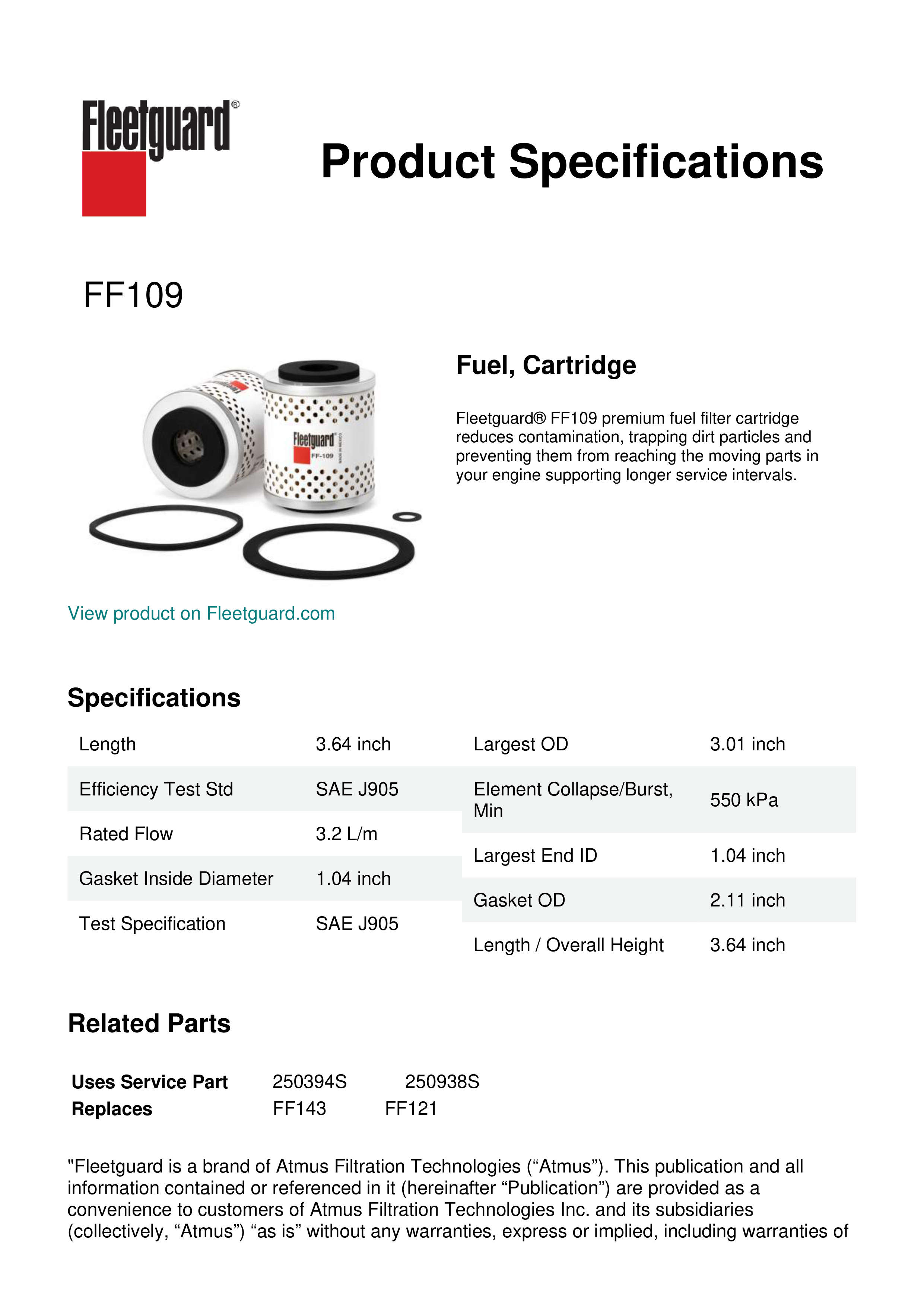 Fleetguard® FF109 premium fuel filter cartridge reduces contamination, trapping dirt particles and preventing them from reaching the moving parts in your engine supporting longer service intervals.Specification