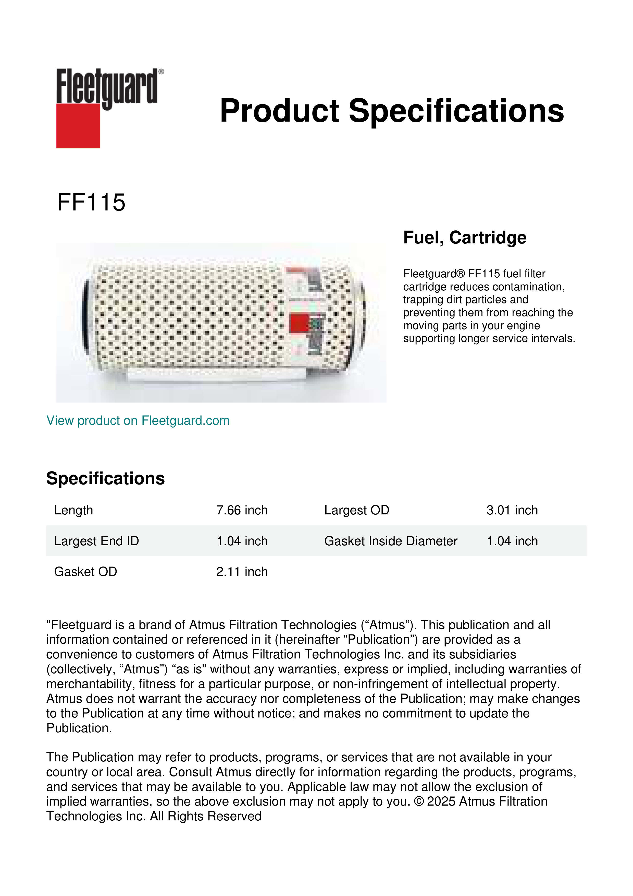 Fleetguard® FF115 fuel filter cartridge reduces contamination, trapping dirt particles and preventing them from reaching the moving parts in your engine supporting longer service intervals.Specification