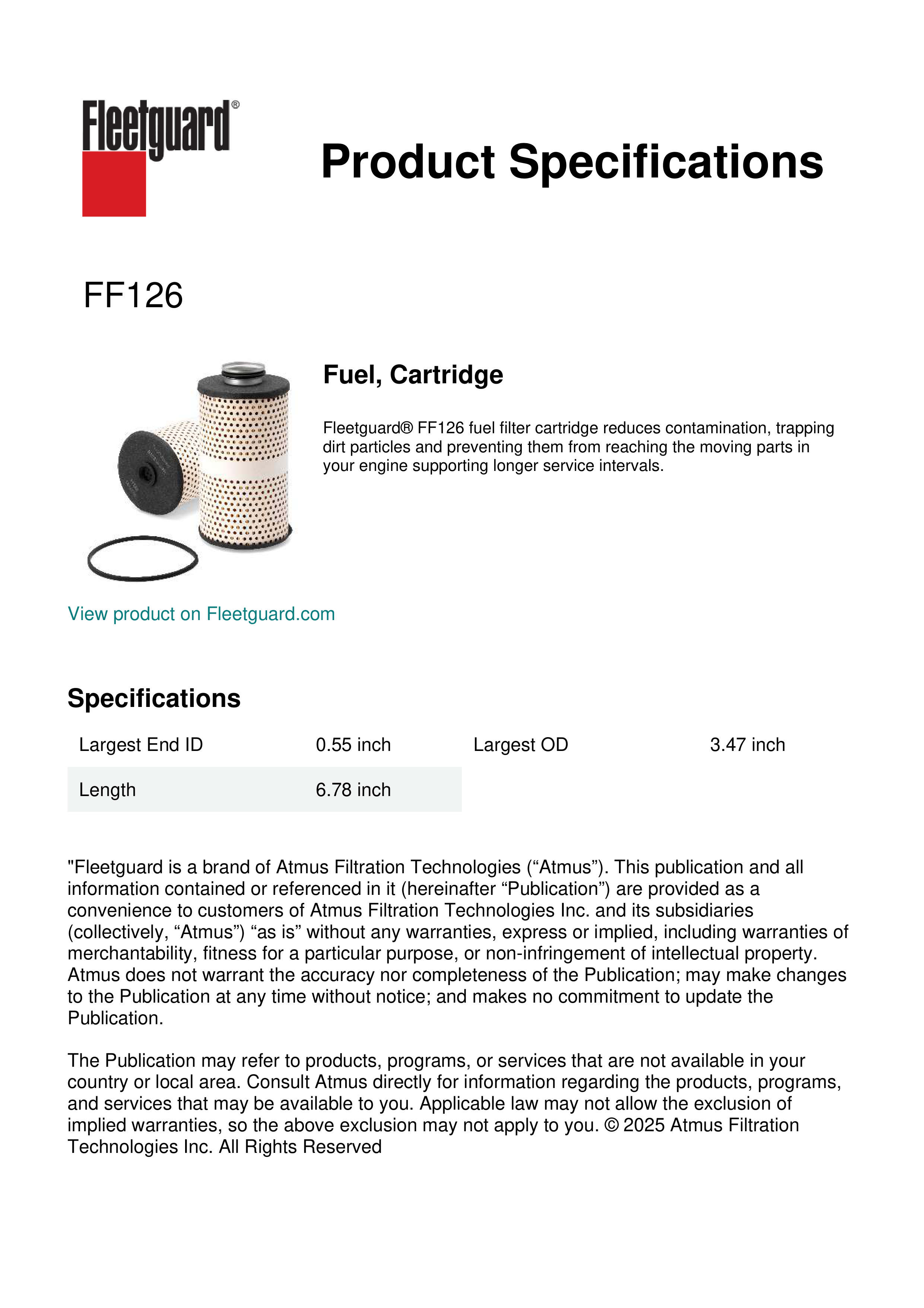 Fleetguard® FF126 fuel filter cartridge reduces contamination, trapping dirt particles and preventing them from reaching the moving parts in your engine supporting longer service intervals.Specification