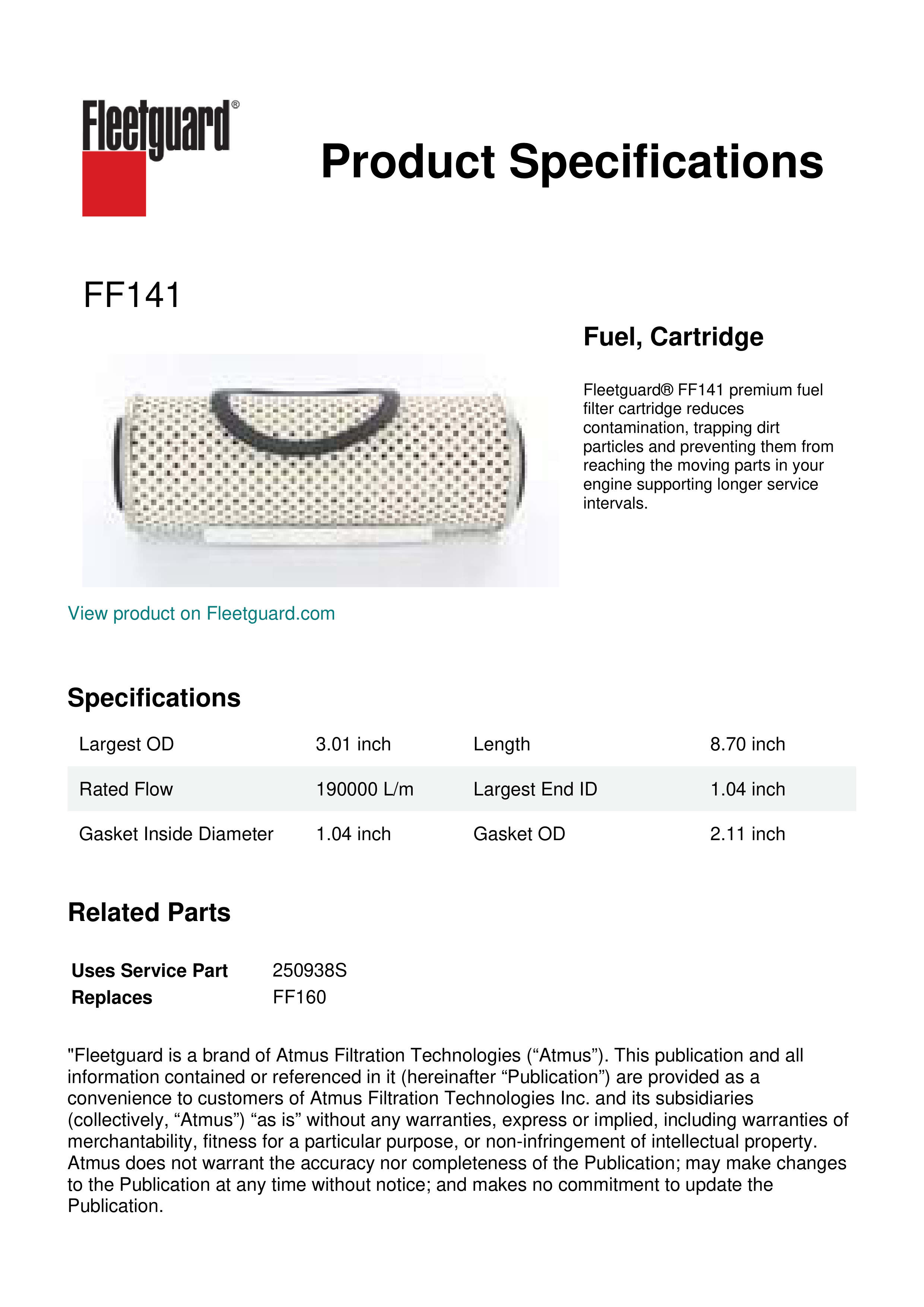 Fleetguard® FF141 premium fuel filter cartridge reduces contamination, trapping dirt particles and preventing them from reaching the moving parts in your engine supporting longer service intervals.Specification