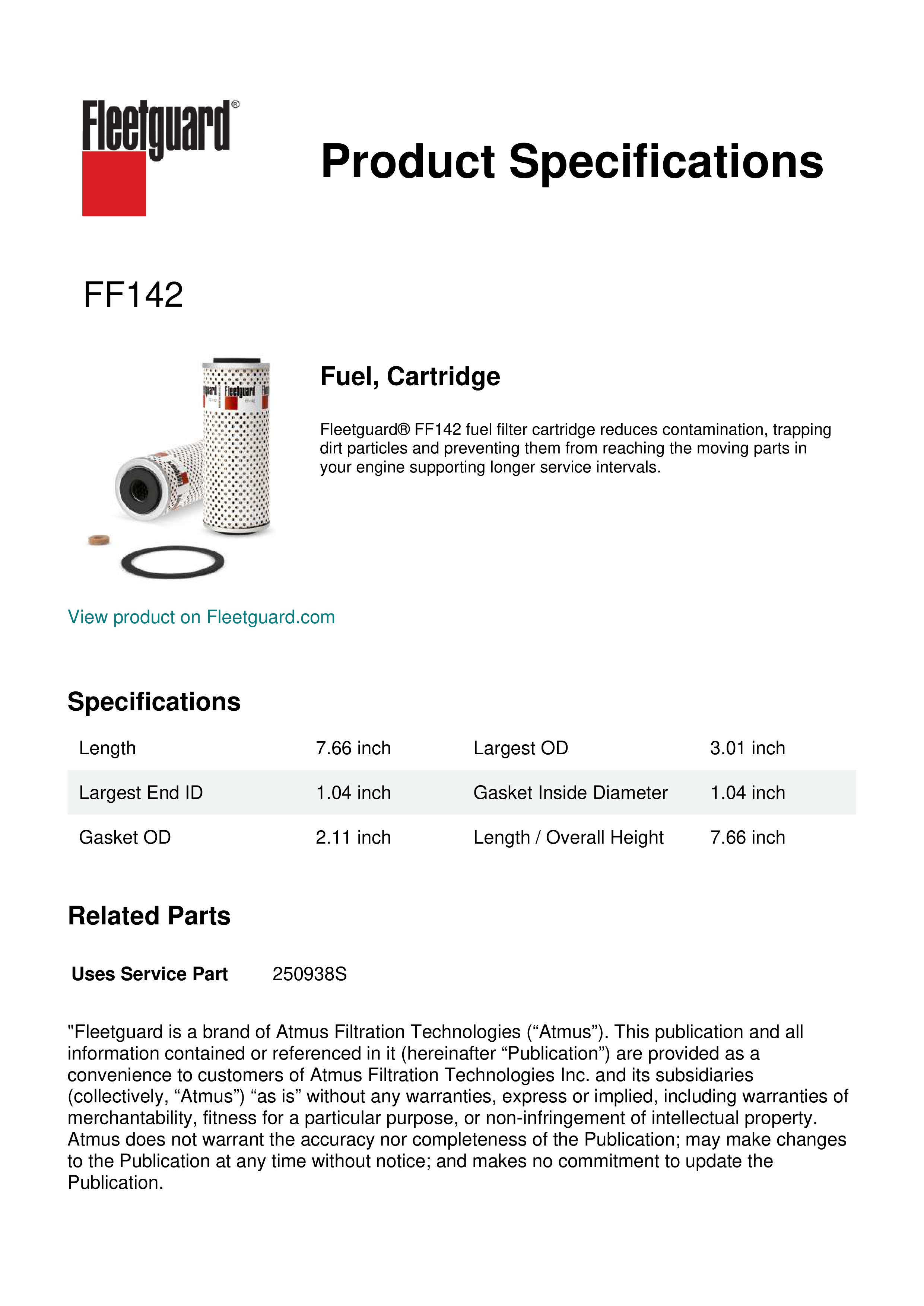 Fleetguard® FF142 fuel filter cartridge reduces contamination, trapping dirt particles and preventing them from reaching the moving parts in your engine supporting longer service intervals.Specification