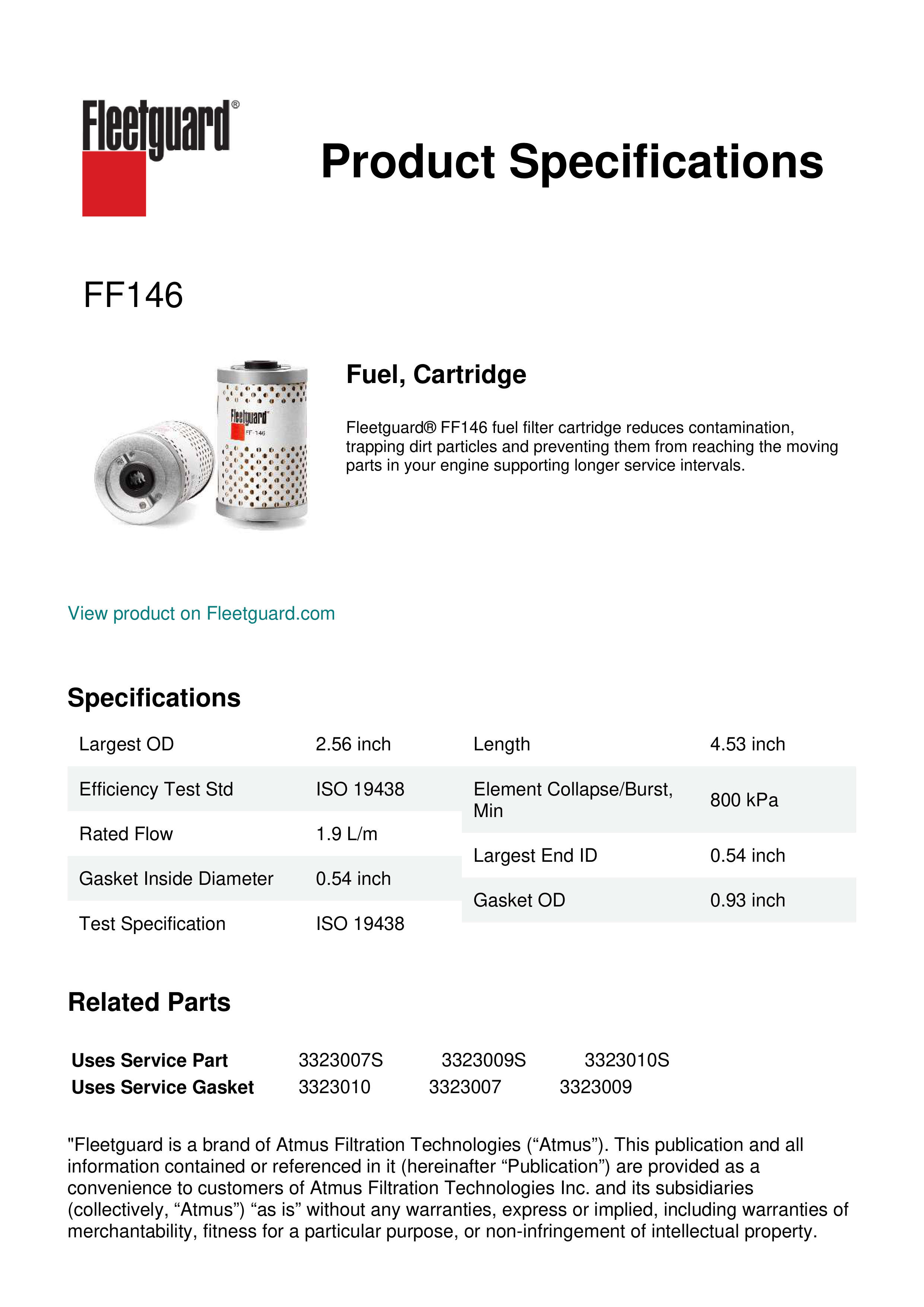 Fleetguard® FF146 fuel filter cartridge reduces contamination, trapping dirt particles and preventing them from reaching the moving parts in your engine supporting longer service intervals.Specification
