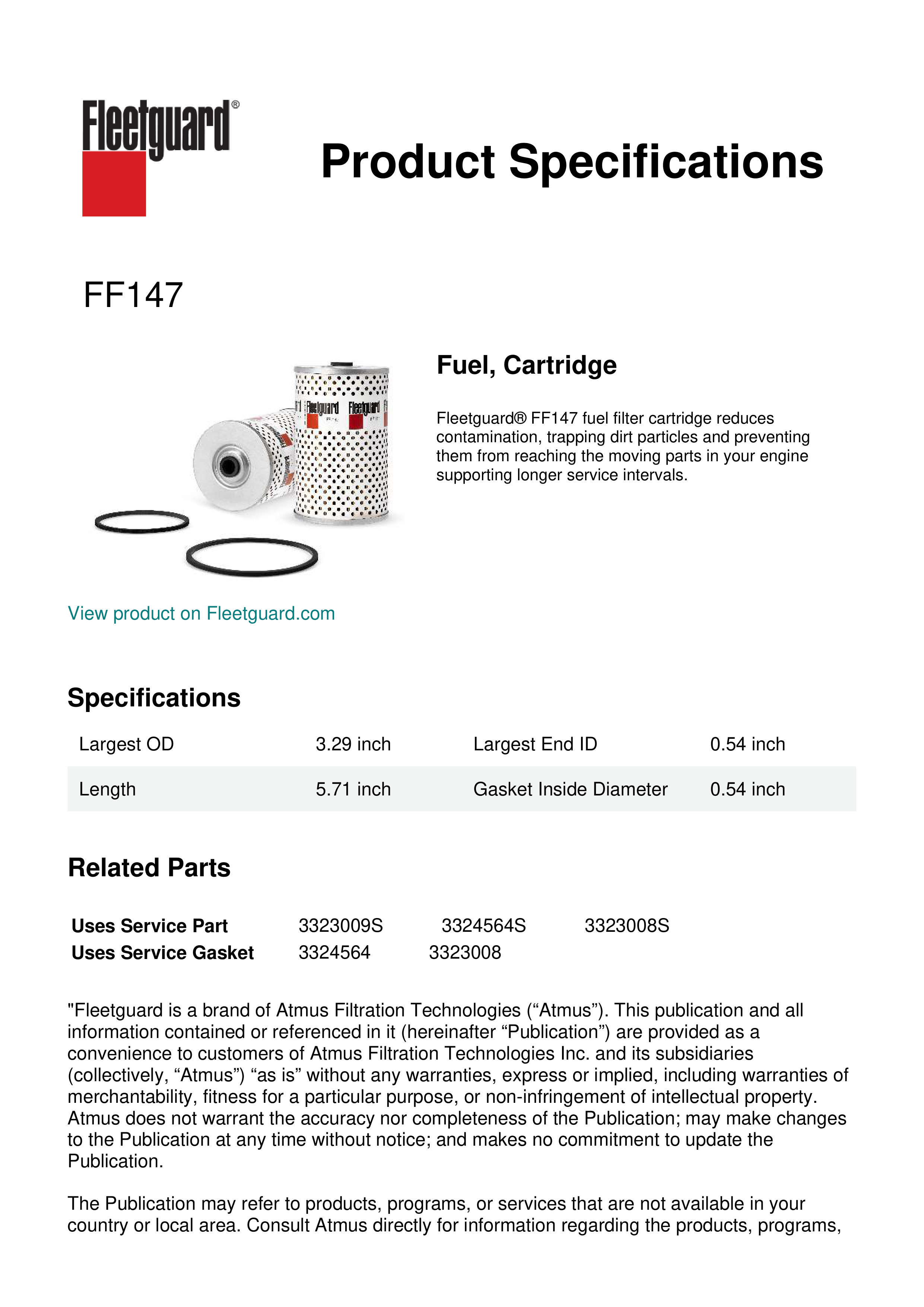 Fleetguard® FF147 fuel filter cartridge reduces contamination, trapping dirt particles and preventing them from reaching the moving parts in your engine supporting longer service intervals.Specification