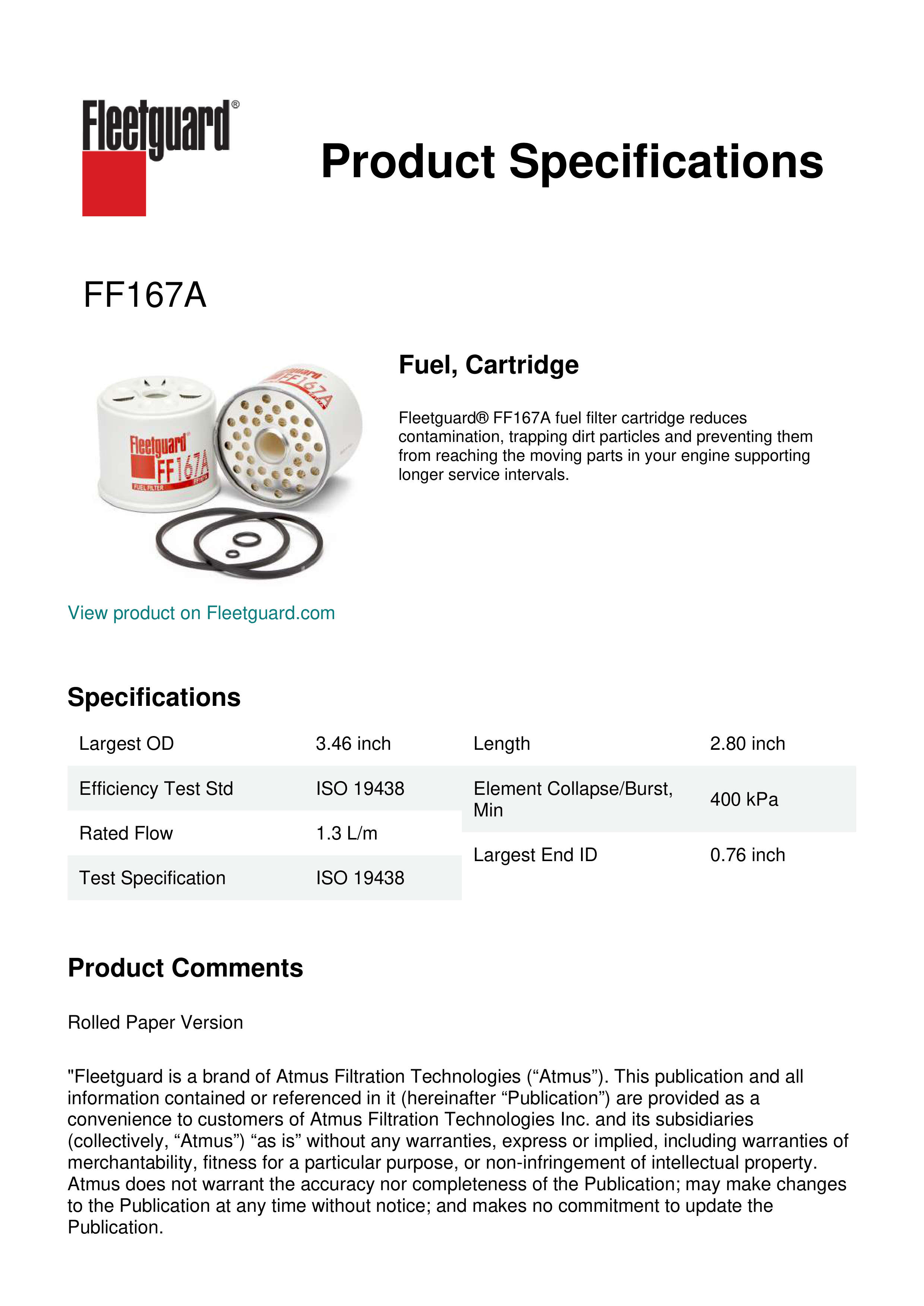 Fleetguard® FF167A fuel filter cartridge reduces contamination, trapping dirt particles and preventing them from reaching the moving parts in your engine supporting longer service intervals.Specification