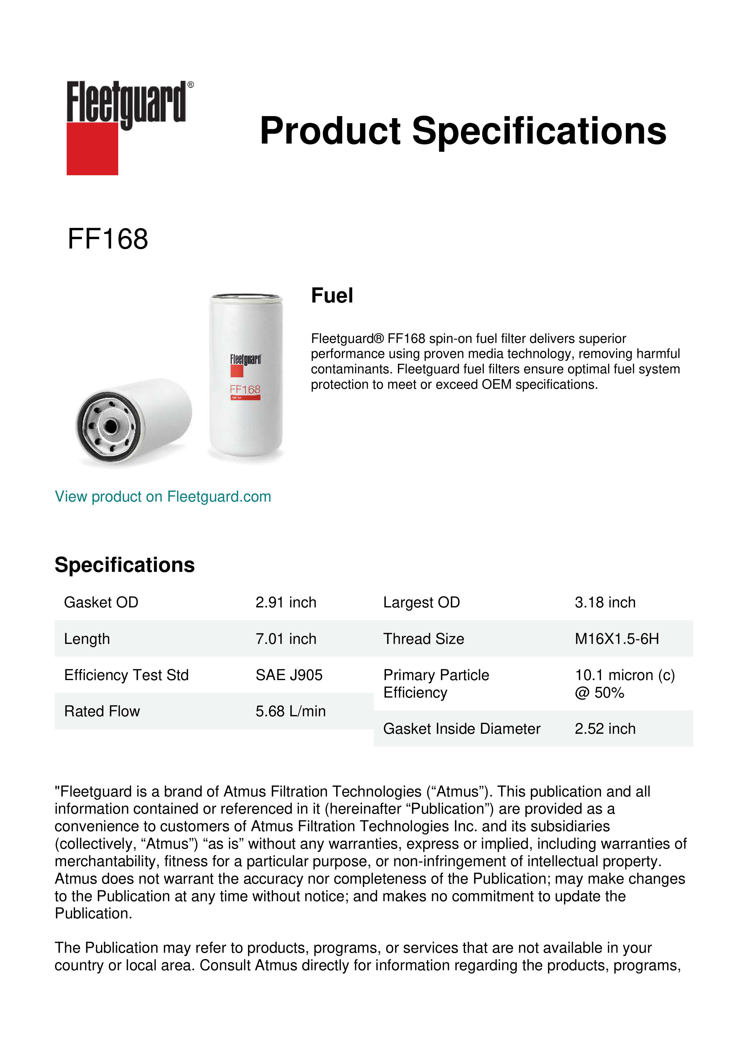 Fleetguard® FF168 spin-on fuel filter delivers superior performance using proven media technology, removing harmful contaminants. Fleetguard fuel filters ensure optimal fuel system protection to meet or exceed OEM specifications.Specification