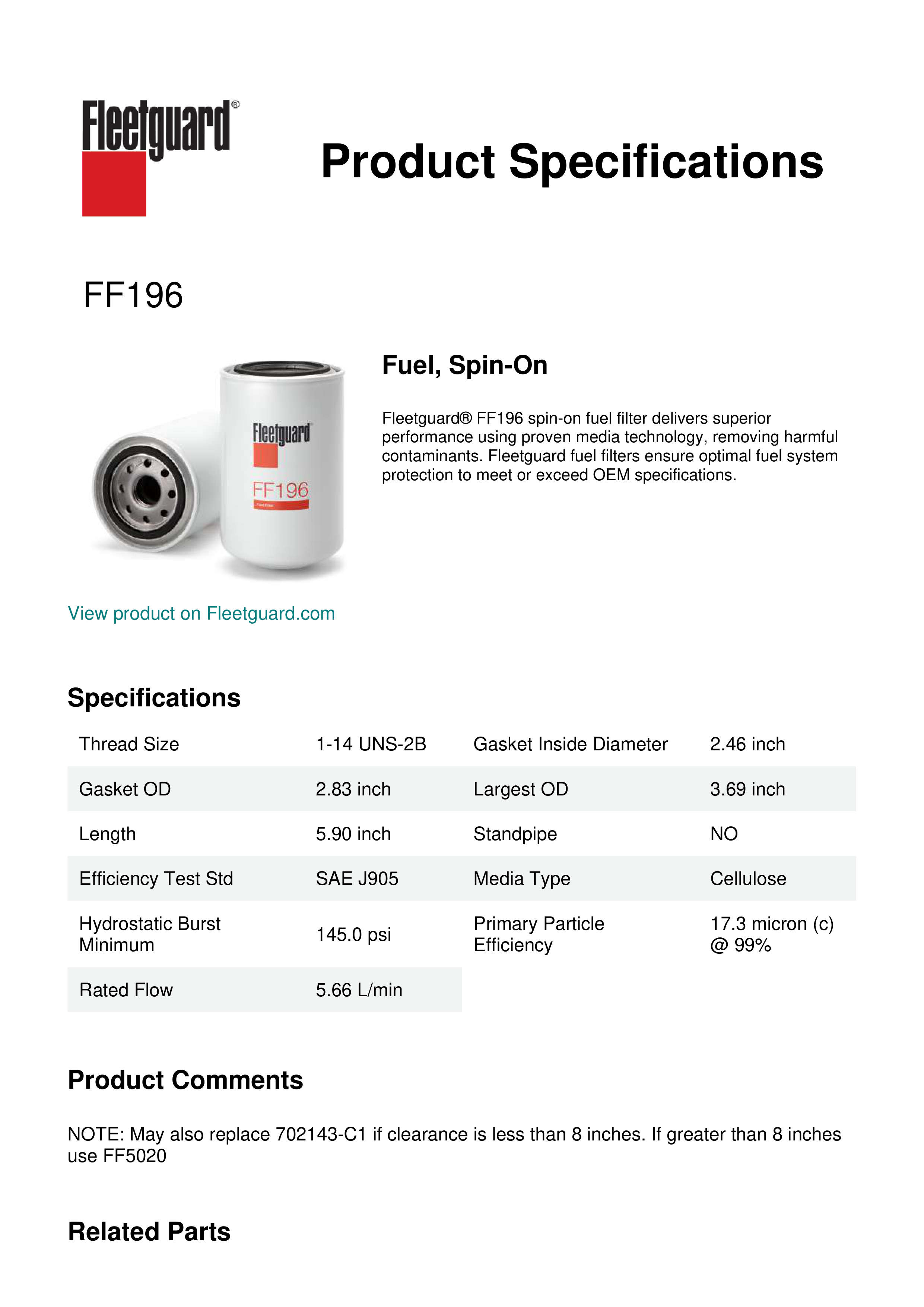 Fleetguard® FF196 spin-on fuel filter delivers superior performance using proven media technology, removing harmful contaminants. Fleetguard fuel filters ensure optimal fuel system protection to meet or exceed OEM specifications.Specification