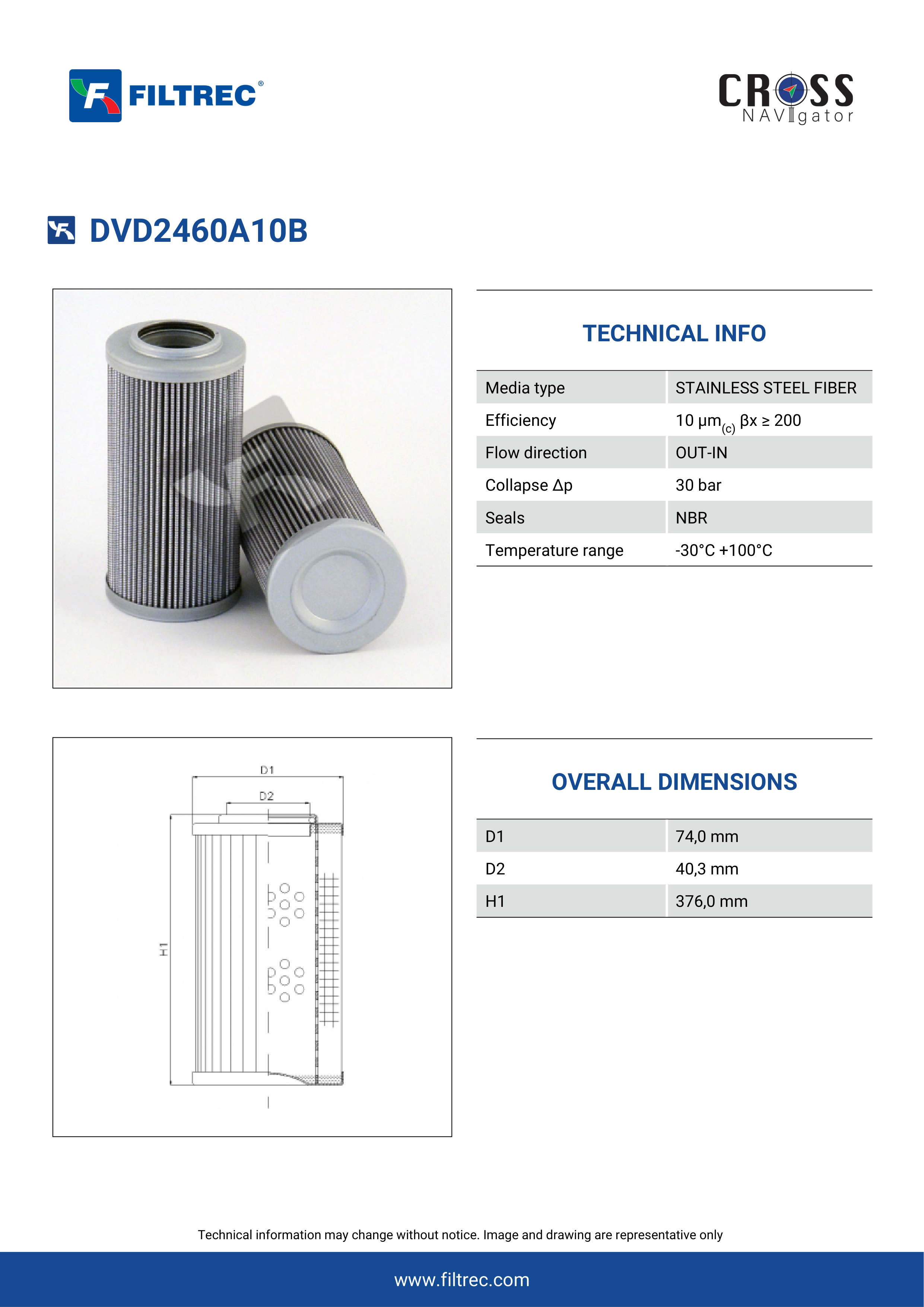 Genuine Filtrec DVD2460A10B. This Filtrec element is designed to meet or exceed the quality and performance of brand OEM’s ensuring superior filtration performance and long-lasting durability.