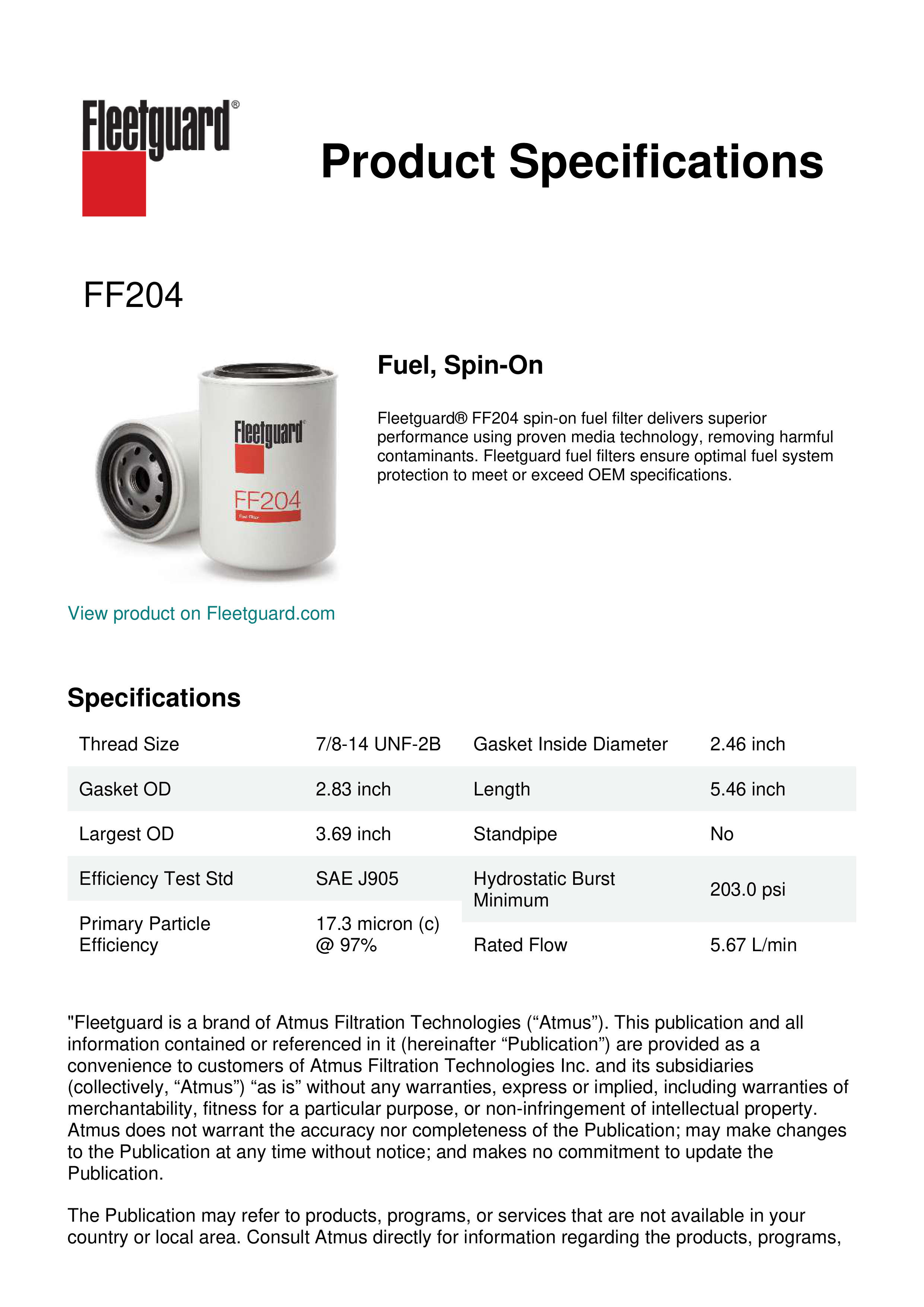 Fleetguard® FF204 spin-on fuel filter delivers superior performance using proven media technology, removing harmful contaminants. Fleetguard fuel filters ensure optimal fuel system protection to meet or exceed OEM specifications.Specification