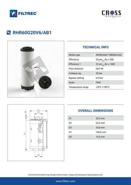 Genuine Filtrec RHR60G20V6/AB1. This Filtrec element is designed to meet or exceed the quality and performance of brand OEM’s ensuring superior filtration performance and long-lasting durability.Engineered with their high performance media and a durable design, the RHR60G20V6/AB1 provides reliable and consistent performance over its lifespan, even in harsh operating environments. When you order from FilterFinder, you can trust that you are getting a reliable and high-quality replacement filter that will keep your system running smoothly.