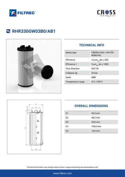 Engineered with their high performance media and a durable design, the RHR330GW03B0/AB1 provides reliable and consistent performance over its lifespan, even in harsh operating environments. When you order from FilterFinder, you can trust that you are getting a reliable and high-quality replacement filter that will keep your system running smoothly.
