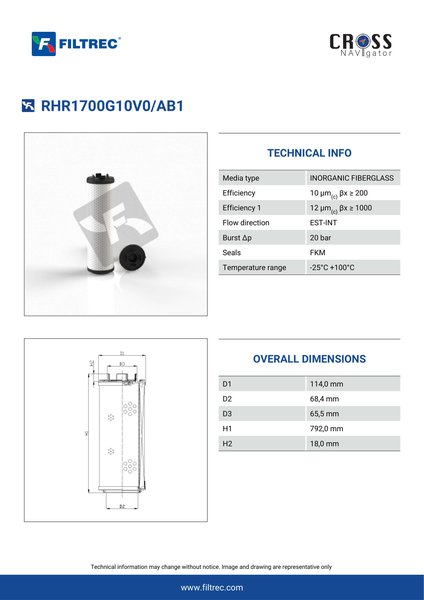Genuine Filtrec RHR1700G10V0/AB1. This Filtrec element is designed to meet or exceed the quality and performance of brand OEM’s ensuring superior filtration performance and long-lasting durability.Engineered with their high performance media and a durable design, the RHR1700G10V0/AB1 provides reliable and consistent performance over its lifespan, even in harsh operating environments. When you order from FilterFinder, you can trust that you are getting a reliable and high-quality replacement filter that will keep your system running smoothly.