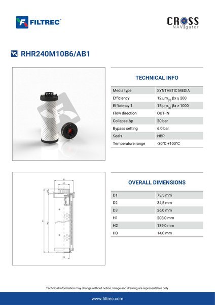Genuine Filtrec RHR240M10B6/AB1. This Filtrec element is designed to meet or exceed the quality and performance of brand OEM’s ensuring superior filtration performance and long-lasting durability.Engineered with their high performance media and a durable design, the RHR240M10B6/AB1 provides reliable and consistent performance over its lifespan, even in harsh operating environments. When you order from FilterFinder, you can trust that you are getting a reliable and high-quality replacement filter that will keep your system running smoothly.
