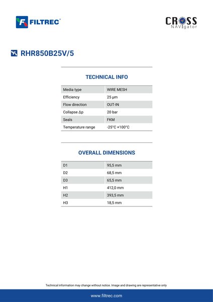 Genuine Filtrec RHR850B25V/5. This Filtrec element is designed to meet or exceed the quality and performance of brand OEM’s ensuring superior filtration performance and long-lasting durability.