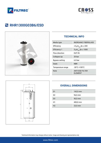 The efficiency of the element is shown using the Micron (µ) and Beta (β) ratings. The micron rating indicates the size of the particle being filtered and the beta rating the efficiency, calculated as 1/β.